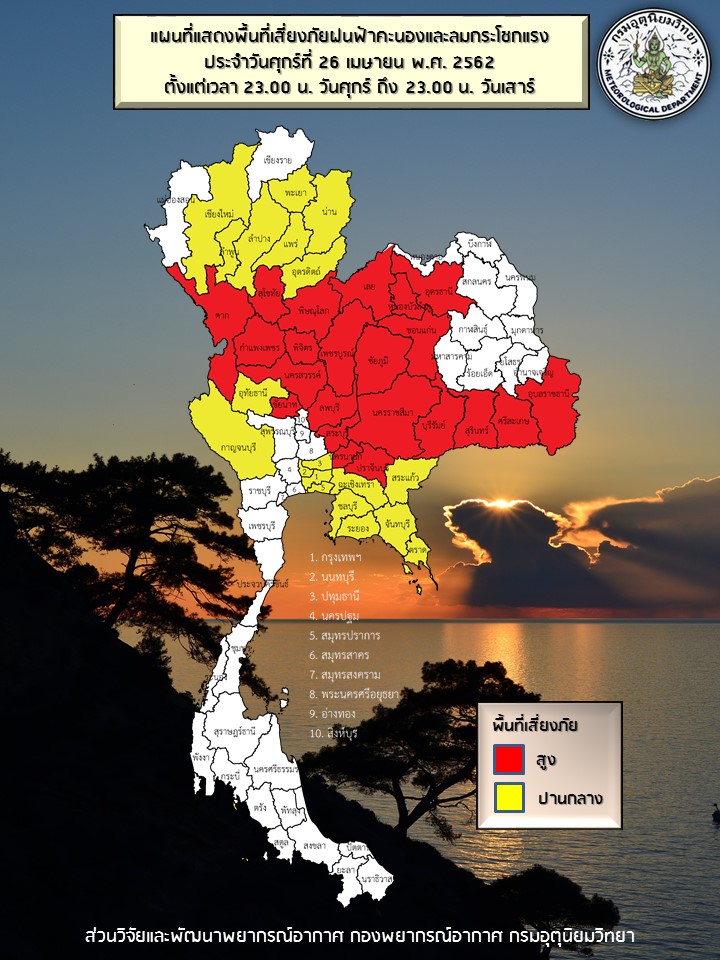 - บริเวณประเทศไทยตอนบนมีพายุฤดูร้อนขึ้น ในขณะที่บริเวณดังกล่าวมีอากาศร้อนโดยทั่วไปและมีอากาศร้อนจัดหลายพื้นที่ ซึ่งจะมีลักษณะของพายุฝนฟ้าคะนอง ลมกระโชกแรง และลูกเห็บตกบางพื้นที่บริเวณภาคเหนือ ภาคตะวันออกเฉียงเหนือ ภาคกลาง และภาคตะวันออก รวมทั้งกรุงเทพมหานครและปริมณฑล ขอให้ประชาชนบริเวณประเทศไทยตอนบนระวังอันตรายจากลมกระโชกแรง ควรอยู่ห่างจากต้นไม้ใหญ่ สิ่งปลูกสร้าง และป้ายโฆษณาที่ไม่แข็งแรง สำหรับภาคใต้ยังคงมีฝนฟ้าคะนองบางพื้นที่