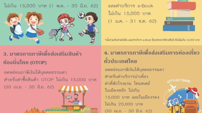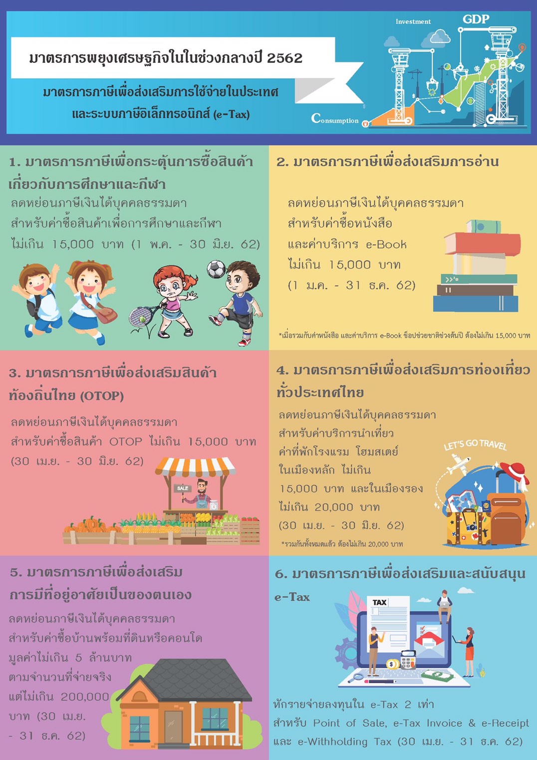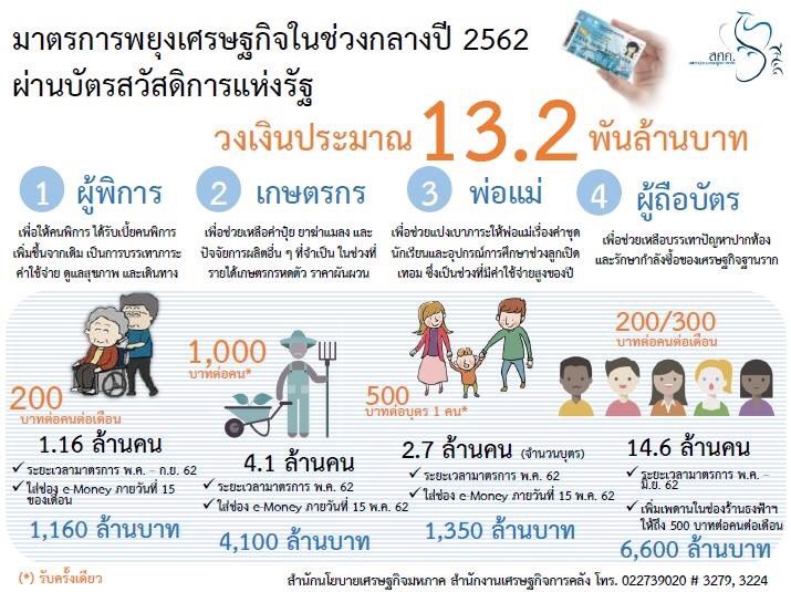 - 30 เม.ย. 62 ครม. มีมติเห็นชอบมาตรการพยุงเศรษฐกิจกลางปี 2562 จากผลกระทบการชะลอตัวจากเศรษฐกิจโลก ประกอบด้วย กลุ่มมาตรการช่วยเหลือผ่านบัตรสวัสดิการของรัฐ จำนวน 4 มาตรการ วงเงินรวม 13,200 ล้านบาท ได้แก่ 1.เพิ่มเงินช่วยคนพิการ 1,160 ล้านบาท 2.ช่วยเหลือค่าครองชีพเกษตรกร 4,100 ล้านบาท 3.ช่วยเหลือค่าครองชีพในส่วนค่าใช้จ่ายช่วงเปิดเทอมให้แก่ผู้มีรายได้น้อย 1,350 ล้านบาท และ 4.ช่วยเหลือผู้มีรายได้น้อย โดยเพิ่มเงินสำหรับซื้อสินค้าในบัตรสวัสดิการแห่งรัฐ เป็น 500 บาท/คน/เดือน วงเงิน 6,600 ล้านบาท และกลุ่มมาตรการในส่วนการช่วยเหลือทางด้านภาษี ได้แก่ 1.ขยายเวลามาตรการลดหย่อนภาษีท่องเที่ยวเมืองรองที่สิ้นสุดเดือน ธ.ค. 61 โดยจะขยายไปถึงการท่องเที่ยวเมืองหลักและเมืองรอง โดยให้นำค่าใช้จ่ายจากค่าที่พักและการเดินทาง มาหักค่าลดหย่อนภาษีได้ไม่เกิน 15,000 บาทต่อคน มาตรการลดหย่อนภาษีสำหรับผู้ที่ซื้อหนังสือ ไม่เกิน 15,000 บาท มาตรการลดภาษีสินค้าโอทอป ลดหย่อนภาษีซื้อหนังสืออุปกรณ์การเรียน และเครื่องกีฬา