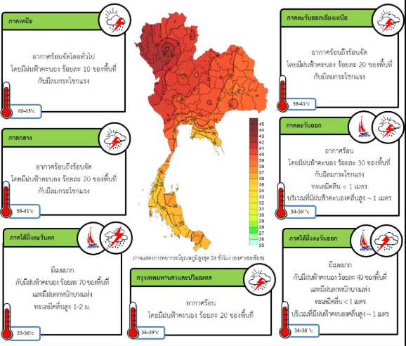 ประเทศไทยตอนบนมีอากาศร้อนถึงร้อนจัด กับมีฝนฟ้าคะนองและลมกระโชกแรงในภาคเหนือ ภาคตะวันออกเฉียงเหนือ ภาคกลาง และภาคตะวันออก ขอให้ประชาชนบริเวณดังกล่าวระวังอันตรายจากลมกระโชกแรง ควรอยู่ห่างจากต้นไม้ใหญ่ สิ่งปลูกสร้าง และป้ายโฆษณาที่ไม่แข็งแรง รวมถึงฟ้าผ่า ส่วนภาคใต้มีฝนลดลงแต่ยังคงฝนฟ้าคะนอง และมีฝนตกหนักกับลมกระโชกแรงบางแห่ง