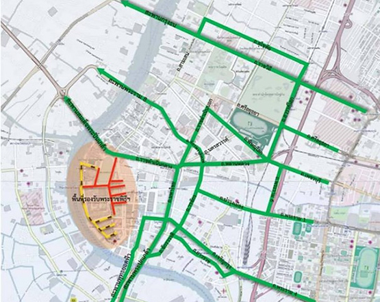 1. เส้นทางจากฝั่งพระนคร – ฝั่งธนบุรี (ทางด่วน) ลงด่วนยมราช ใช้เส้นทาง ถนนสวรรคโลก – ถนนราชวิถี หรือ ถนนสุโขทัย – สะพานกรุงธนบุรี (ซังฮี้), ลงด่วนยมราช ใช้เส้นทาง ถนนหลานหลวง – ถนนจักรพรรดิพงษ์ หรือ ถนนราชดำเนินนอก – แยก จปร. – สะพานพระราม 8, ลงด่วนยมราช ใช้เส้นทาง พิษณุโลก – แยกสวนมิสกวัน – ถนนราชดำเนินนอก – แยก จปร. – สะพานพระราม 8 และ ลงด่วนยมราช ใช้เส้นทาง ถนนหลานหลวง – ถนนราชดำเนินกลาง – สะพานสมเด็จพระปิ่นเกล้า ในส่วนของ (ทางพื้นราบ) ให้ใช้เส้นทางบริเวณ ถนนศรีอยุธยา – ถนนสวรรค์โลก – ถนนราชวิถี หรือ ถนนสุโขทัย – สะพานกรุงธนบุรี (ซังฮี้), ถนนเพชรบุรี – ถนนหลานหลวง – ถนนจักรพรรดิพงษ์ หรือ ถนนราชดำเนินนอก – แยก จปร. – สะพานพระราม 8, ถนนพระราม 1 หรือ ถนนเพชรบุรี – ถนนหลานหลวง – ถนนราชดำเนินกลาง – สะพานสมเด็จพระปิ่นเกล้า, ถนนพระราม 4 – ถนนเยาวราช – ถนนจักรวรรดิ – สะพานพระปกเกล้า และ ถนนพระราม 4 – ถนนสาทรใต้ – สะพานตากสิน