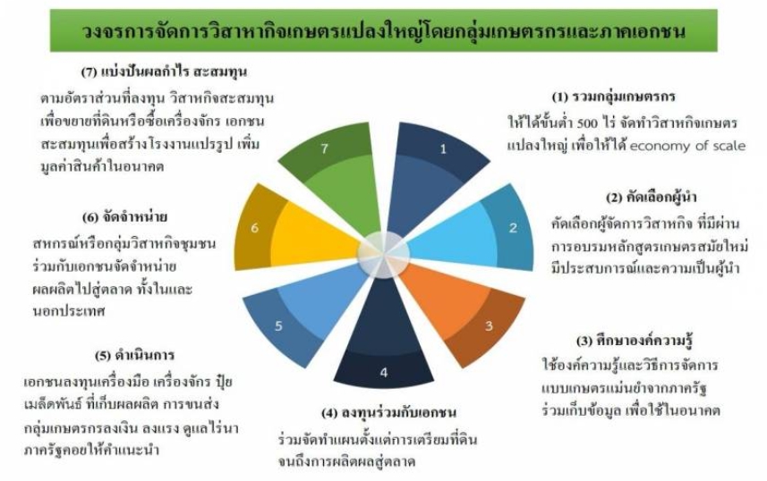 - รมว.กษ. (นายกฤษฎาฯ) ได้สั่งการให้มีการกำหนดเขตวิสาหกิจแปลงใหญ่ให้มีขนาดพื้นที่ติดกันรวมกันแล้วไม่น้อยกว่า 500 ไร่ ขึ้นไป เพื่อก่อให้เกิดการประหยัดต่อขนาดจากการผลิต รวมถึงจัดระบบครบวงจร รัฐ เอกชน เจ้าของที่ดิน เกษตรกร โดยมีเป้าหมายปฏิรูปเกษตรทั้งโครงสร้าง