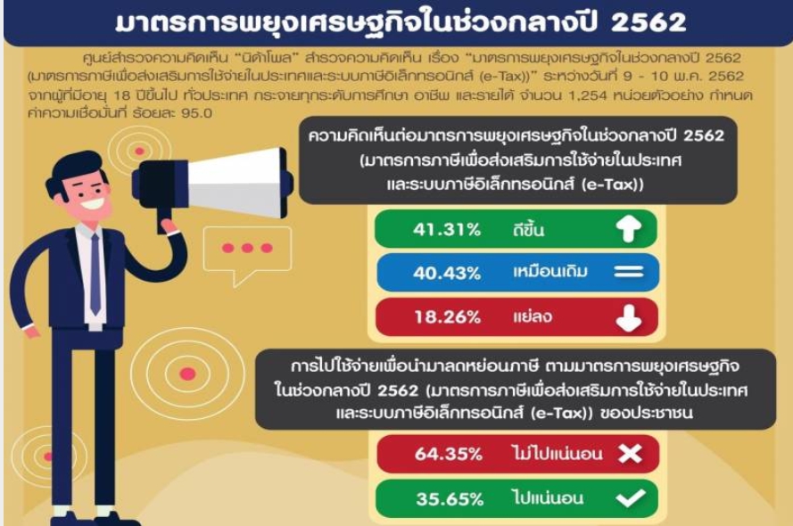 - ศูนย์สำรวจความคิดเห็น “นิด้าโพล” สถาบันบัณฑิตพัฒนบริหารศาสตร์ (นิด้า) เผยผลสำรวจความคิดเห็นของประชาชน เรื่อง “มาตรการพยุงเศรษฐกิจในช่วงกลางปี 62” โดยได้สำรวจระหว่างวันที่ 9 – 10 พ.ค.62 พบว่า ประชาชนแสดงความคิดเห็นต่อมาตรการพยุงเศรษฐกิจในช่วงกลางปี 62 โดยเฉพาะมาตรการภาษี เพื่อส่งเสริมการใช้จ่ายในประเทศ และระบบภาษีอิเล็กทรอนิกส์ (e-Tax) ว่าจะทำให้เศรษฐกิจไทยดีขึ้นประมาณร้อยละ 41.31 เศรษฐกิจไทยเหมือนเดิม ร้อยละ 40.43 และเศรษฐกิจไทยแย่ลง ร้อยละ 18.26 และได้เสนอให้มาตรการพยุงเศรษฐกิจที่อยากให้มีเพิ่มอีกด้วย เช่น มาตรการพยุงราคาสินค้าอุปโภค บริโภค ค่าสาธารณูปโภค เป็นต้น