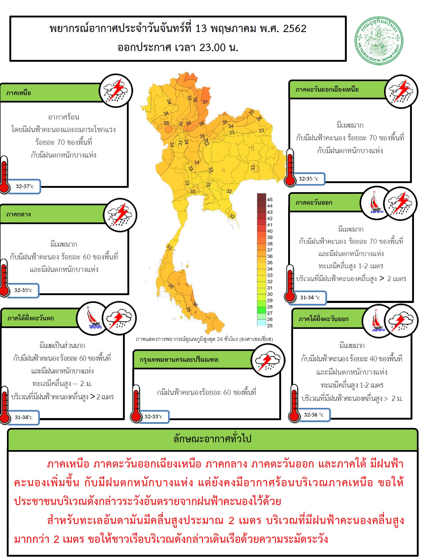 - ภาคเหนือ ภาคตะวันออกเฉียงเหนือ ภาคกลาง ภาคตะวันออก และภาคใต้ ยังคงมีฝนฟ้าคะนองกับมีฝนตกหนักบางแห่ง แต่ยังคงมีอากาศร้อนบริเวณภาคเหนือ ขอให้ประชาชนบริเวณดังกล่าวระวังอันตรายจากฝนฟ้าคะนองไว้ด้วย