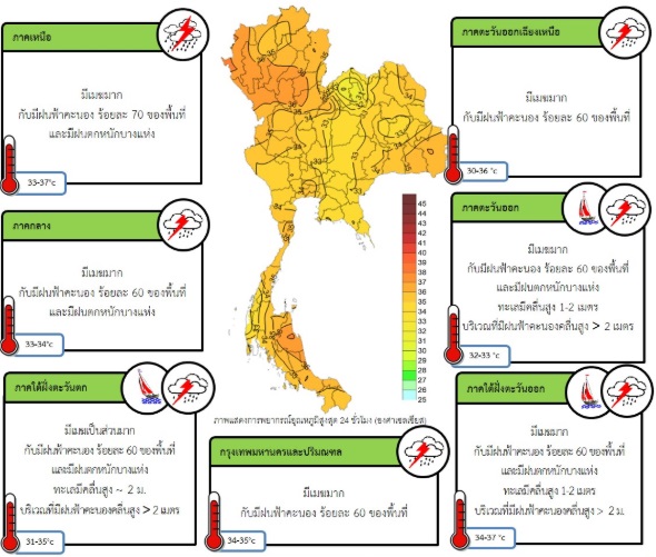 - พยากรณ์อากาศ 24 ชั่วโมงข้างหน้า ภาคเหนือ ภาคตะวันออกเฉียงเหนือ ภาคกลาง ภาคตะวันออก และภาคใต้ ยังคงมีฝนฟ้าคะนองหลายพื้นที่กับมีฝนตกหนักบางแห่ง ขอให้ประชาชนบริเวณดังกล่าวระวังอันตรายจากฝนฟ้าคะนองและฝนตกหนักไว้ด้วย สำหรับทะเลอันดามันมีคลื่นสูงประมาณ 2 เมตร บริเวณที่มีฝนฟ้าคะนองคลื่นสูงมากกว่า 2 เมตร ขอให้ชาวเรือบริเวณดังกล่าวเดินเรือด้วยความระมัดระวัง กรุงเทพมหานครและปริมณฑลมีเมฆมาก กับมีฝนฟ้าคะนอง ร้อยละ 60 ของพื้นที่ อุณหภูมิต่ำสุด 25-26 องศาเซลเซียส อุณหภูมิสูงสุด 34-37 องศาเซลเซียส ลมตะวันตกเฉียงใต้ ความเร็ว 10-25 กม./ชม.
