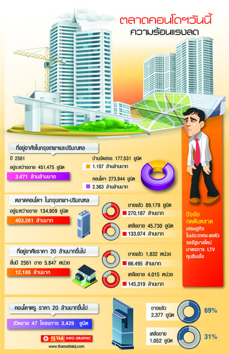 - คอนโดล้นกรุง 4 หมื่นยูนิต 1.3 แสนล.รอขาย – นายภัทรชัย ทวีวงศ์ รองผู้อำนวยการฝ่ายวิจัย บริษัท คอล ลิเออร์ส อินเตอร์เนชั่นแนล (ประเทศไทย) จำกัด กล่าวว่า ภาพรวมตลาดอสังหาริมทรัพย์ในปัจจุบันน่ากังวล เนื่องจากมีอุปทานเหลือขายค่อนข้างมาก โดยเฉพาะคอนโดมิเนียมในพื้นที่กรุงเทพฯรวมกันกว่า 4.2 หมื่นยูนิต อย่างไรก็ตาม ตั้งแต่เดือนมิถุนายนไปจนถึงครึ่งปีหลัง ผู้ประกอบการทุกรายคงเร่งเปิดตัวโครงการใหม่ออกสู่ตลาด หลังจากไตรมาสแรกวุ่นกับการกระตุ้นให้ลูกค้ารีบซื้อรีบโอนกรรมสิทธิ์ก่อนมาตรการคุมสินเชื่อบ้านของธนาคารแห่งประเทศไทยมีผลบังคับใช้วันที่ 1 เม.ย. 2562 ทั้งนี้ ในสต๊อกที่มีกว่า 4.2 หมื่นยูนิต คอนโดมิเนียมกลุ่มระดับราคา 3-5 ล้านบาท มีเหลือขายค่อนข้างมาก ผู้ซื้อกลุ่มใหญ่เป็นพนักงานออฟฟิศ มีปัญหาการเลิกจ้างงาน ขณะที่ระดับราคา 1.5-2.5 ล้านบาทยังไปได้ แต่ผู้ซื้อกลุ่มนี้มีปัญหาหนี้ครัวเรือนทำให้ยอดปฏิเสธสินเชื่อค่อนข้างสูงเฉพาะอย่างยิ่งกลุ่มราคา 1.5 ล้านบาท ส่วนกลุ่มราคา 5 ล้านบาทขึ้นไป ซึ่งส่วนใหญ่เป็นผู้ซื้อลงทุน ก็เริ่มระมัดระวังมากขึ้นหลังมาตรการรัฐเริ่มมีผลบังคับใช้