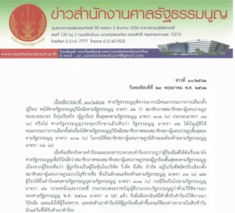 - ศาลรัฐธรรมนูญมีมติเป็นเอกฉันท์รับคำร้องที่คณะกรรมการการเลือกตั้ง (กกต.) ขอให้ศาลรัฐธรรมนูญวินิจฉัยตามมาตรา 82 ว่า นายธนาธร จึงรุ่งเรืองกิจ หัวหน้าพรรคอนาคตใหม่ มีลักษณะต้องห้ามตามรัฐธรรมนูญ มาตรา 98 (3) กรณีถือครองหุ้นบริษัท วี-ลัคมีเดีย จำกัด ที่อาจมีผลทำให้ขาดคุณสมบัติในการดำรงตำแหน่ง สมาชิกสภาผู้แทนราษฎร ตามรัฐธรรมนูญมาตรา 101 (6) ประกอบมาตรา 98 (3) ไว้พิจารณาวินิจฉัย และได้มีมติเสียงข้างมาก (8:1 เสียง) ให้นายธนาธรหยุดปฏิบัติหน้าที่สมาชิกสภาผู้แทนราษฎรไว้จนกว่าศาลจะมีคำวินิจฉัย ทั้งนี้ ศาลรัฐธรรมนูญให้เหตุผลว่า คดีดังกล่าวคณะกรรมการการเลือกตั้งได้ขอให้ศาลรัฐธรรมนูญมีคำสั่งให้นายธนาธรหยุดปฏิบัติหน้าที่ตามรัฐธรรมนูญ มาตรา 82 วรรคสอง และปรากฏข้อมูลจากเอกสารประกอบคำร้องว่าตลอดระยะเวลา 10 ปีที่ผ่านมา การเปลี่ยนแปลงผู้ถือหุ้นทุกครั้งจะส่งสำเนาบัญชีรายชื่อผู้ถือหุ้นระบุวันประชุมวิสามัญผู้ถือหุ้น พร้อมมีหนังสือนำส่งนายทะเบียนหุ้นส่วนบริษัทกรุงเทพมหานครในเวลาใกล้ชิดกัน ซึ่งแตกต่างจากการเปลี่ยนแปลงผู้ถือหุ้นในคดีนี้ตามเอกสารประกอบคำร้องที่ไม่ปรากฏว่ามีการประชุมวิสามัญผู้ถือหุ้น จึงปรากฏเหตุอันควรสงสัยว่านายธนาธรมีกรณีตามที่ถูกร้อง ประกอบกับการปฏิบัติหน้าที่ของนายธนาธรอาจก่อให้เกิดปัญหาข้อกฎหมายและการคัดค้านโต้แย้งเป็นอุปสรรคต่อการดำเนินงานสำคัญของที่ประชุมสภาผู้แทนราษฎรได้