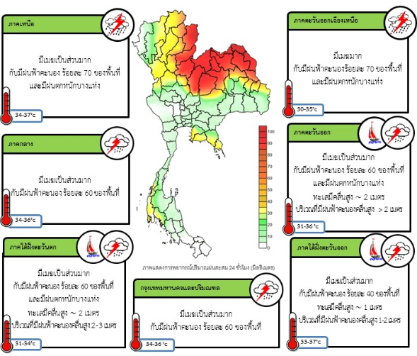บริเวณภาคเหนือ ภาคตะวันออกเฉียงเหนือ ภาคตะวันออก และภาคใต้ มีฝนฟ้าคะนองเพิ่มมากขึ้นและมีฝนตกหนักบางแห่ง ขอให้ประชาชนในพื้นที่เสี่ยงภัยระวังอันตรายจากฝนตกหนัก ซึ่งอาจทำให้เกิดน้ำท่วมฉับพลัน น้ำป่าไหลหลากได้ สำหรับทะเลอันดามันและอ่าวไทยตอนบน มีคลื่นสูงประมาณ 2 เมตร บริเวณที่มีฝนฟ้าคะนองคลื่นสูง 2-3 เมตร ขอให้ชาวเรือบริเวณดังกล่าวเดินเรือด้วยความระมัดระวัง