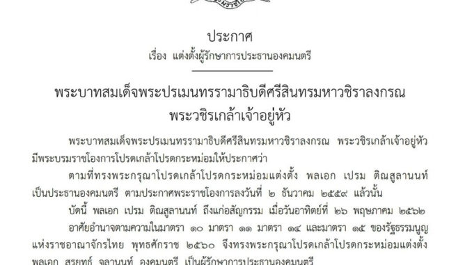 - เมื่อวันที่ 28 พ.ค. เว็บไซต์ราชกิจจานุเบกษา เผยแพร่ประกาศเรื่อง แต่งตั้งผู้รักษาการประธานองคมนตรี พระบาทสมเด็จพระปรเมนทรรามาธิบดีศรีสินทรมหาวชิราลงกรณ พระวชิรเกล้าเจ้าอยู่หัว มีพระบรมราชโองการโปรดเกล้าโปรดกระหม่อมให้ประกาศว่า ตามที่ทรงพระกรุณาโปรดเกล้าโปรดกระหม่อมแต่งตั้ง พลเอก เปรม ติณสูลานนท์ เป็นประธานองคมนตรี ตามประกาศพระราชโองการลงวันที่ 2 ธันวาคม 2559 แล้วนั้น บัดนี้ พลเอก เปรม ติณสูลานนท์ ถึงแก่อสัญกรรม เมื่อวันอาทิตย์ที่ 26 พฤษภาคม 2562 อาศัยอำนาจตามความในมาตรา 10 มาตรา11 มาตรา 14 และมาตรา 15 ของรัฐธรรมนูญแห่งราชอาณาจักรไทย พุทธศักราช 2560 จึงทรงพระกรุณาโปรดเกล้าโปรดกระหม่อมแต่งตั้ง พลเอก สุรยุทธ์ จุลานนท์ องคมนตรี เป็นผู้รักษาการประธานองคมนตรี ทั้งนี้ ตั้งแต่วันที่ 27 พฤษภาคม พุทธศักราช 2562 ประกาศ ณ วันที่ 27 พฤษภาคม พุทธศักราช 2562 เป็นปีที่ 4 ในรัชกาลปัจจุบัน