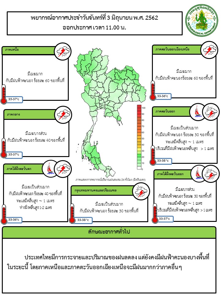 - พยากรณ์อากาศ 24 ชั่วโมงข้างหน้า ประเทศไทยมีการกระจายปริมาณฝนลดลง แต่ยังคงมีฝนฟ้าคะนองบางพื้นที่ในระยะนี้ โดยภาคเหนือและภาคตะวันออกเฉียงเหนือมีฝนมากกว่าภาคอื่น ๆ สำหรับกรุงเทพมหานครและปริมณฑลมีเมฆเป็นส่วนมาก กับมีฝนฟ้าคะนอง ร้อยละ 30 ของพื้นที่ อุณหภูมิต่ำสุด 25-27 องศาเซลเซียส อุณหภูมิสูงสุด 33 – 38 องศาเซลเซียส ลมตะวันตกเฉียงใต้ ความเร็ว 10-20 กม./ชม.