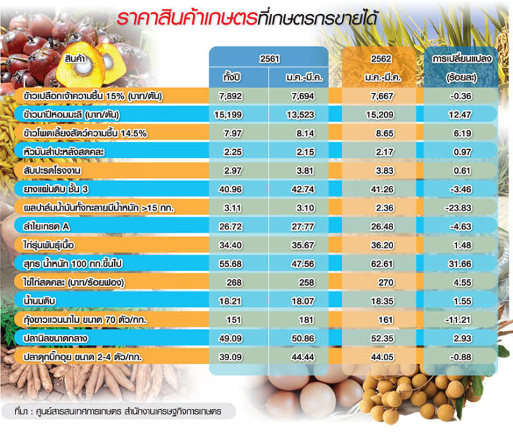 - สำนักงานเศรษฐกิจการเกษตรได้วิเคราะห์และประมาณการภาวะเศรษฐกิจการเกษตรในไตรมาส 1/2562 เปรียบเทียบกับช่วงเดียวกันของปี 2561 พบว่า ดัชนีผลผลิตสินค้าเกษตรในช่วงเดือนมกราคม-มีนาคม 2562 เฉลี่ยอยู่ที่ระดับ 145.8 หรือเพิ่มขึ้นร้อยละ 0.4 จากช่วงเดียวกันของปี 2561 ซึ่งอยู่ที่ระดับ 145.2 ดัชนีราคาสินค้าเกษตรที่เกษตรกรขายได้เฉลี่ยอยู่ที่ระดับ 127.8 ลดลงจากช่วงเดียวกันที่อยู่ที่ระดับ 128.7 หรือลดลงร้อยละ 0.7 ดัชนีผลผลิตหมวดพืชผลเฉลี่ยอยู่ที่ระดับ 148.0 เพิ่มขึ้นร้อยละ 0.3 จากช่วงเดียวกันที่อยู่ที่ระดับ 147.5 ดัชนีราคาหมวดพืชผลที่เกษตรกรขายได้เฉลี่ยอยู่ที่ระดับ 129.5 ลดลงจากช่วงเดียวกันที่อยู่ที่ระดับ 135.0 หรือลดลงร้อยละ 4.1 ดัชนีผลผลิตหมวดปศุสัตว์เฉลี่ยอยู่ที่ระดับ 167.8 เพิ่มขึ้นร้อยละ 1.5 จากช่วงเดียวกันที่อยู่ที่ระดับ 165.2 และดัชนีราคาหมวดปศุสัตว์ที่เกษตรกรขายได้เฉลี่ยอยู่ที่ระดับ 123.7 เพิ่มขึ้นจากช่วงเดียวกันที่อยู่ที่ระดับ 107.14 หรือเพิ่มขึ้นร้อยละ 15.5 ภาวะเศรษฐกิจการเกษตรในไตรมาส 1/2562 ขยายตัวร้อยละ 0.5 จัดเป็นการขยายตัวได้ในระดับต่ำหรือค่อนข้างทรงตัว ซึ่งเป็นผลมาจากอัตราการขยายตัวของสาขาพืชที่ชะลอลงเป็นหลัก ขณะที่สาขาปศุสัตว์-สาขาประมง-สาขาบริการทางการเกษตร-สาขาป่าไม้ ยังคงขยายตัวเพิ่มขึ้น