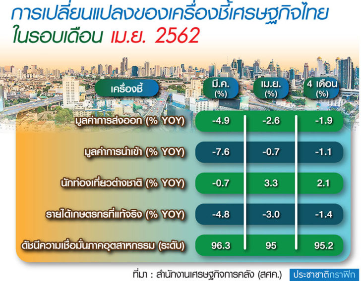 - นายพิสิทธิ์ พัวพันธ์ ผู้อำนวยการสำนักนโยบายเศรษฐกิจมหภาค ในฐานะรองโฆษก สศค. กล่าวว่า ตัวเลขเศรษฐกิจเดือน เม.ย. ถือว่าขยายตัวได้ดีกว่าเดือน มี.ค. เนื่องจากการใช้จ่ายภายในประเทศที่ยังขยายตัวได้ดี และการลงทุนภาคเอกชนที่มีแนวโน้มขยายตัวได้ดีอยู่ ขณะที่การส่งออกยังติดลบ แต่ก็หดตัวน้อยกว่าเดือน มี.ค. นายพิสิทธิ์กล่าวว่า ขณะนี้ส่งออก 4 เดือน หดตัวไป -1.9% ต่อปี โดยไตรมาส 2 และครึ่งปีแรกคงจะติดลบเล็กน้อย และคาดว่าจะฟื้นตัวดีขึ้นในครึ่งปีหลัง โดยการที่ส่งออกติดลบเป็นเหมือนกันทั้งภูมิภาคไม่เฉพาะไทย โดยไทยถือว่าลบไม่มากหากเทียบกับหลาย ๆ ประเทศ