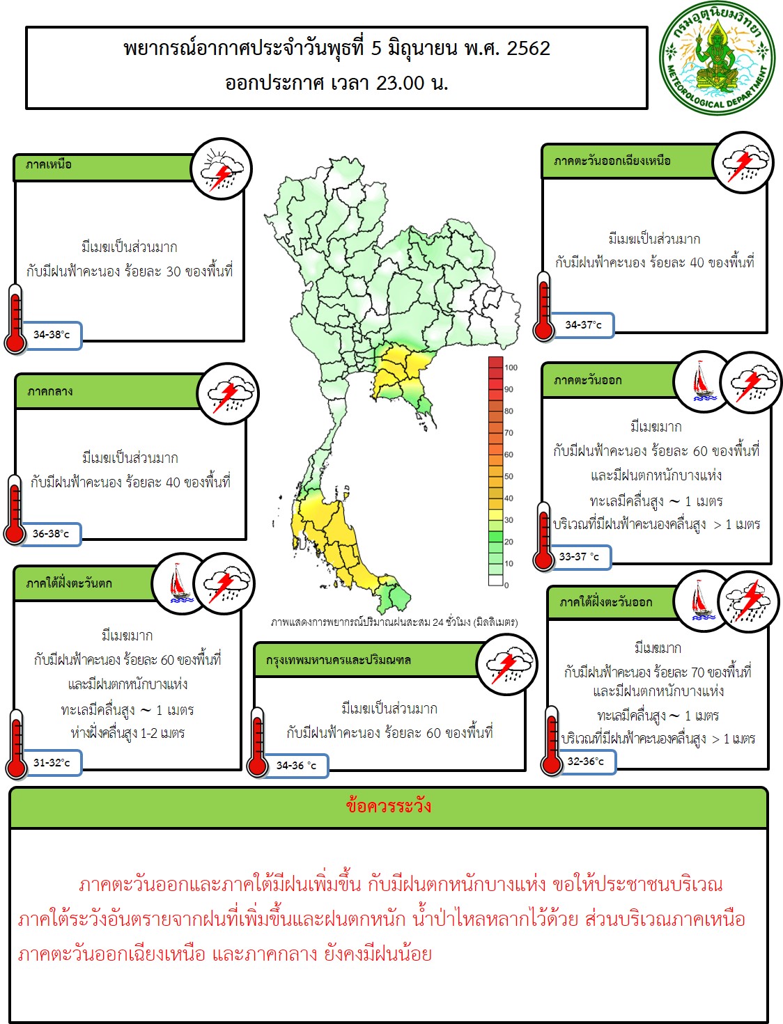 - ประเทศไทยมีฝนตกต่อเนื่อง และมีฝนตกหนักบางแห่ง ในบริเวณภาคตะวันออก และภาคใต้ ขอให้ประชาชนบริเวณภาคใต้ระวังอันตรายจากฝนตกหนัก และน้ำป่าไหลหลากไว้ด้วย