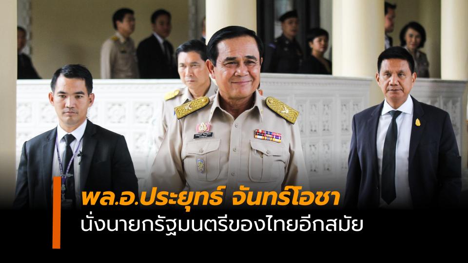 - ที่ประชุมรัฐสภาลงมติเห็นชอบ “พล.อ.ประยุทธ์ จันทร์โอชา” ด้วยคะแนน 500 เสียง ดำรงตำแหน่งนายกรัฐมนตรีคนที่ 30 เมื่อวันที่ 5 มิ.ย. 62 ได้มีการประชุมรัฐสภาเพื่อพิจาณาลงมติเลือกนายกรัฐมนตรี โดยนายณัฎฐพล ทีปสุวรรณ ส.ส.พรรคพลังประชารัฐ เป็นผู้เสนอชื่อ พล.อ.ประยุทธ์ จันทร์โอชา ขณะที่ นางศรีนวล บุญลือ ส.ส.พรรคอนาคตใหม่ ได้เสนอชื่อ นายธนาธร จึงรุ่งเรืองกิจ ซึ่งต่อมา นายชวน หลีกภัย ทำหน้าที่ประธานรัฐสภาได้เปิดโอกาสสมาชิกรัฐสภาอภิปรายคุณสมบัตินายกรัฐมนตรีอย่างเต็มที่ หลังจากมีการอภิปรายนานกว่า 10 ชั่วโมง กระทั่งเวลา 22.00 น. ประธานสภาฯ จึงสั่งปิดการอภิปราย พร้อมกับให้มีการลงมติเห็นชอบผู้สมควรดำรงตำแหน่งนายกฯ โดยที่ประชุมใช้วิธีการอ่านชื่อสมาชิกรัฐสภาเรียงลำดับตามตัวอักษร แล้วให้ขานชื่อผู้ที่จะเลือกให้เป็นนายกฯ นอกจากนี้ที่ประชุมได้แต่งตั้งกรรมการนับคะแนนจำนวน 6 คน จากพรรคต่างๆ ผลการลงมติ พล.อ.ประยุทธ์ จันทร์โอชา ได้คะแนนเห็นชอบ 500 เสียง และนายธนาธร จึงรุ่งเรืองกิจ ได้คะแนนเห็นชอบ 244 เสียง งดออกเสียง 3 เสียง ได้แก่ นายชวน หลีกภัย ประธานสภา, นายพรเพชร วิชิตชลชัย ประธานวุฒิสภา, นายสิริพงศ์ อังคสกุลเกียรติ ส.ส.พรรคภูมิใจไทย