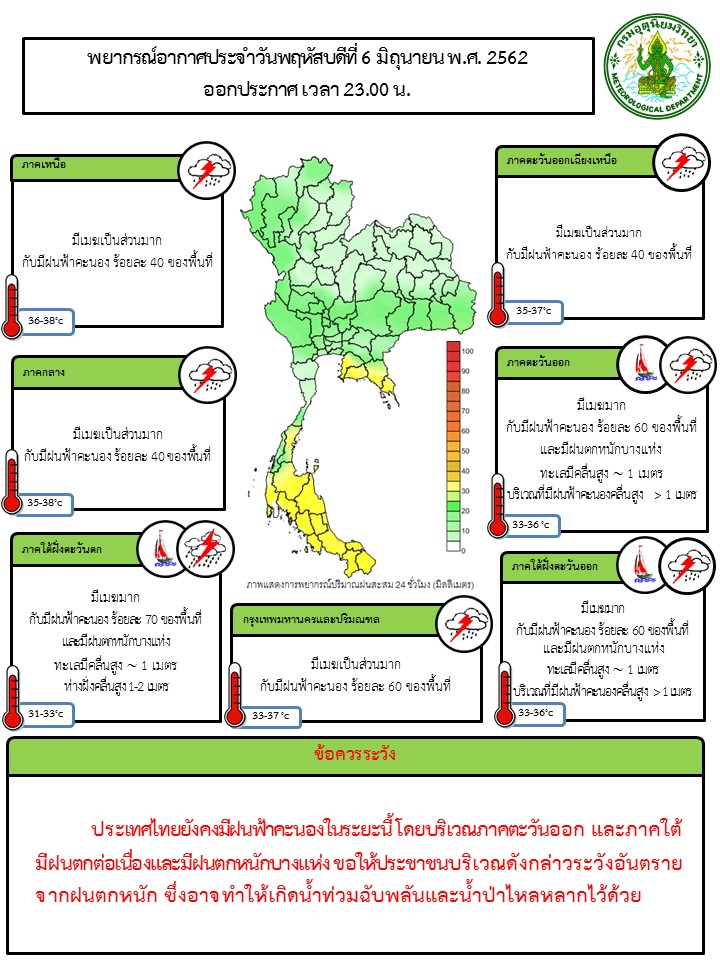 - ไทยยังคงมีฝนฟ้าคะนองในระยะนี้ โดยบริเวณภาคตะวันออก และภาคใต้ มีฝนต่อเนื่องและมีฝนตกหนักบางแห่ง ขอให้ประชาชนบริเวณดังกล่าวระวังอันตรายจากฝนตกหนัก ซึ่งอาจทำให้เกิดน้ำท่วมฉับพลันและน้ำป่าไหลหลากไว้ด้วย