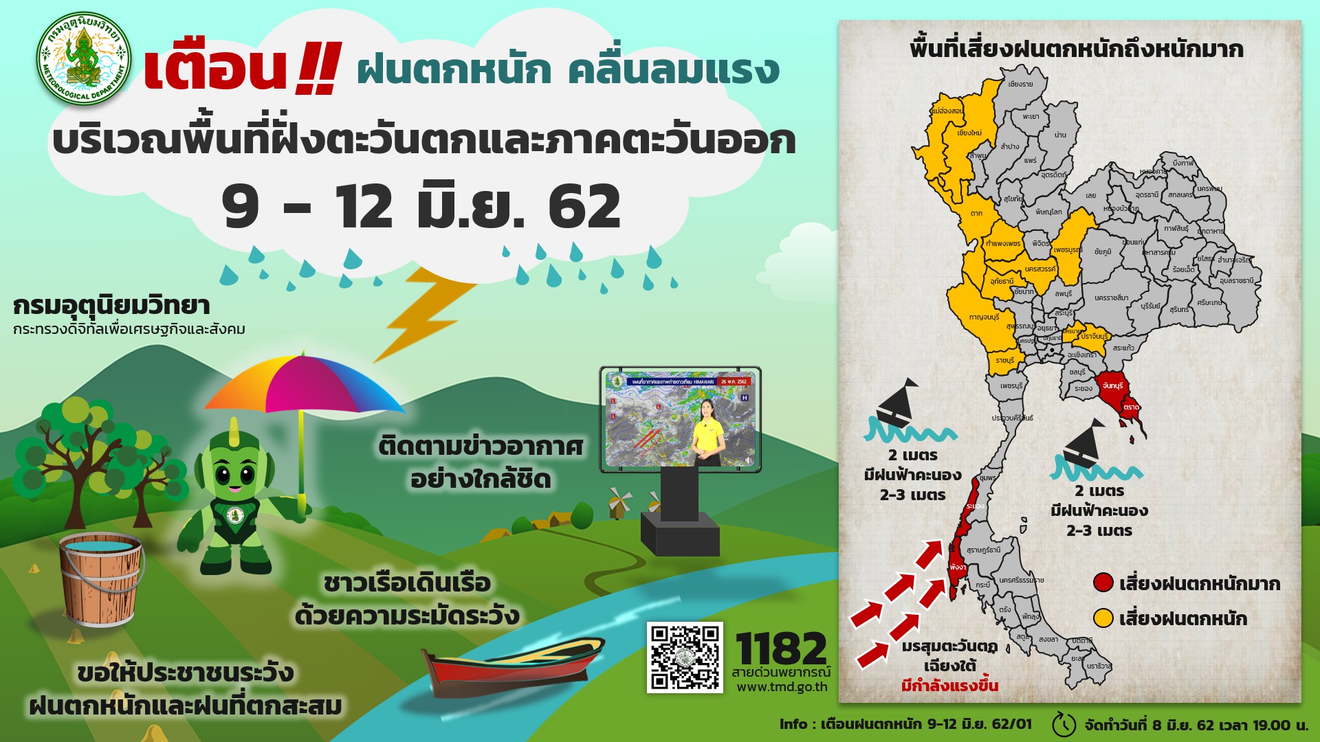 - บริเวณด้านตะวันตกของภาคกลาง ภาคตะวันออก และภาคใต้ ยังคงมีฝนต่อเนื่อง และมีฝนตกหนักบางแห่ง ขอให้ประชาชนบริเวณดังกล่าวระวังอันตรายจากฝนตกหนักและฝนที่ตกสะสม ซึ่งอาจทำให้เกิดน้ำท่วมฉับพลันและน้ำป่าไหลหลากได้
