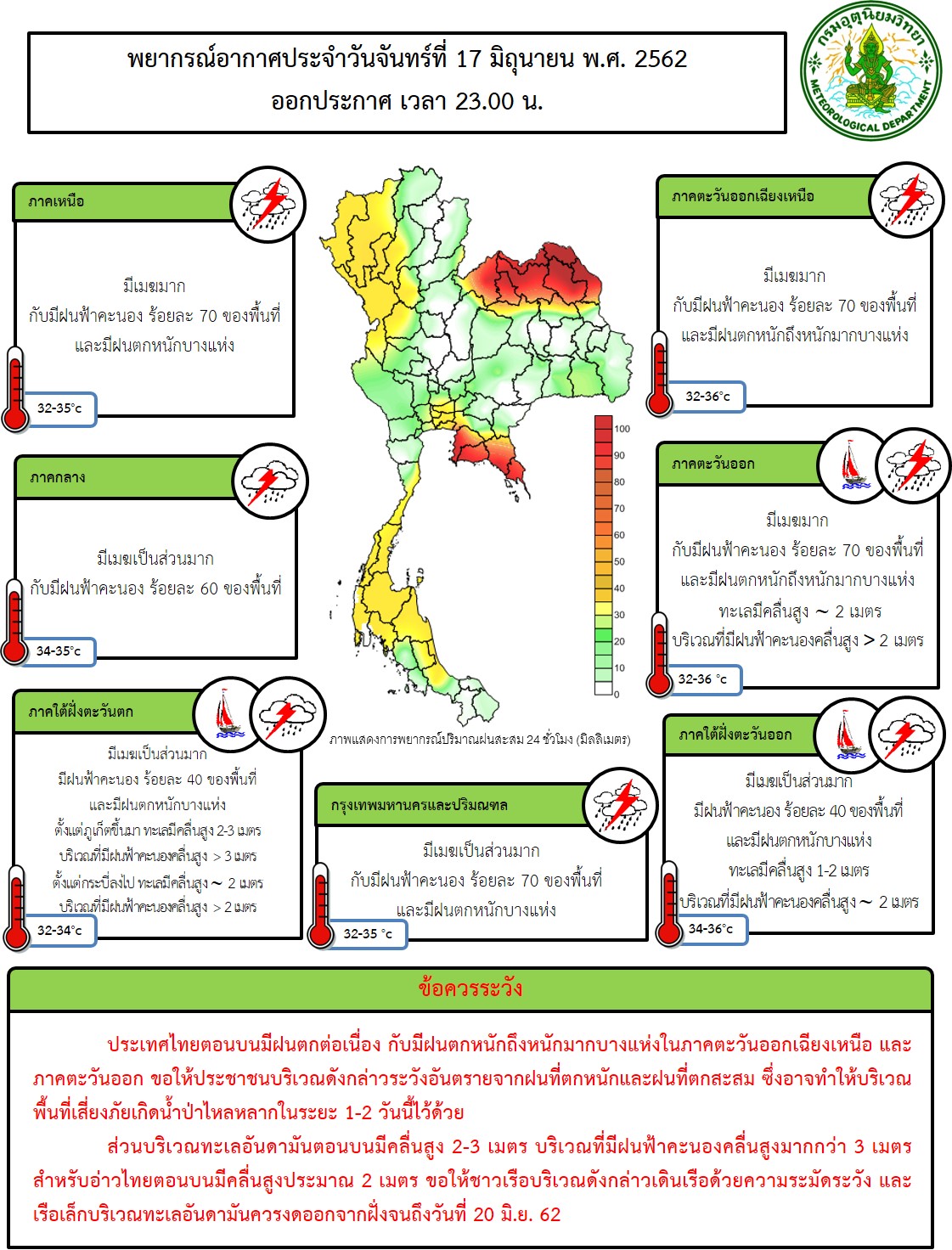 ส่วนบริเวณทะเลอันดามันตอนบนมีคลื่นสูง 2-3 เมตร บริเวณที่มีฝนฟ้าคะนองคลื่นสูงมากกว่า 3 เมตร สำหรับอ่าวไทยตอนบนมีคลื่นสูงประมาณ 2 เมตร ขอให้ชาวเรือบริเวณดังกล่าวเดินเรือด้วยความระมัดระวัง และเรือเล็กบริเวณทะเลอันดามันควรงดออกจากฝั่งจนถึงวันที่ 20 มิ.ย. 62