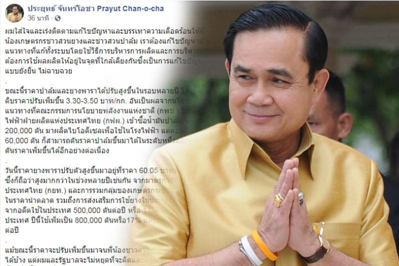 - เมื่อวันที่ 19 มิ.ย. เวลา 15.00 น. พล.อ.ประยุทธ์ จันทร์โอชา นรม. และหัวหน้า คสช. โพสต์ข้อความผ่านเฟซบุ๊ก “ประยุทธ์ จันทร์โอชา Prayut Chan-o-cha” ระบุว่า ผมใส่ใจและเร่งติดตามแก้ไขปัญหาและบรรเทาความเดือดร้อนให้พี่น้องเกษตรกรชาวสวนยางและชาวสวนปาล์ม เราต้องแก้ไขปัญหาด้วยแนวทางที่แก้ทั้งระบบโดยใช้วิธีการบริหารการผลิตและการบริหารความต้องการใช้ผลผลิตให้อยู่ในจุดที่ใกล้เคียงกันซึ่งเป็นการแก้ไขปัญหาแบบยั่งยืน ไม่ฉาบฉวย ขณะนี้ราคาปาล์มและยางพาราได้ปรับสูงขึ้นในรอบหลายปี โดยปาล์มดิบราคาปรับเพิ่มขึ้น 3.30-3.50 บาท/กก. อันเป็นผลจากนโยบายและแนวทางที่คณะกรรมการนโยบายพลังงานแห่งชาติได้ให้การไฟฟ้าฝ่ายผลิตแห่งประเทศไทยเข้าซื้อน้ำมันปาล์มดิบ 200,000 ตัน มาผลิตไบโอดีเซลเพื่อใช้ในโรงไฟฟ้า แต่ตอนนี้ซื้อไปแค่ 60,000 ตัน ก็สามารถดันราคาปาล์มขึ้นมาได้ในระดับหนึ่งและคาดว่าจะดันราคาเพิ่มขึ้นได้อีกอย่างต่อเนื่อง วันนี้ราคายางพาราปรับตัวสูงขึ้นมาอยู่ที่ราคา 60.05 บาทต่อกิโลกรัม ซึ่งก็ถือว่าสูงมากกว่าในช่วงหลายปีเช่นกัน จากมาตรการที่การยางแห่งประเทศไทย และการรวมกลุ่มของเกษตรกรเข้าไปซื้อยางพาราในราคานำตลาด รวมถึงการส่งเสริมการใช้ยางในประเทศให้มากขึ้น จากอดีตใช้ในประเทศ 500,000 ตันต่อปี หรือ 14% ของผลผลิตในประเทศ ปีนี้ใช้เพิ่มเป็น 800,000 ตันหรือ17% และส่งออก 4 ล้านตันต่อปี แม้ขณะนี้ราคาจะปรับเพิ่มขึ้นมาจนพี่น้องชาวสวนยางสวนปาล์มพอยิ้มได้บ้าง แต่ผมและรัฐบาลจะไม่หยุดที่จะคิดและลงมือทำทุกวิถีทางเพื่อชีวิตที่ดีขึ้นของพี่น้องชาวสวนยางสวนปาล์มรวมถึงพี่น้องเกษตรกรทุกกลุ่มให้มีคุณภาพชีวิตที่ดีขึ้นต่อไป ยิ้มและฝ่าฟันทุกอย่างไปพร้อมกันด้วยความจริงใจ …สวัสดีครับ