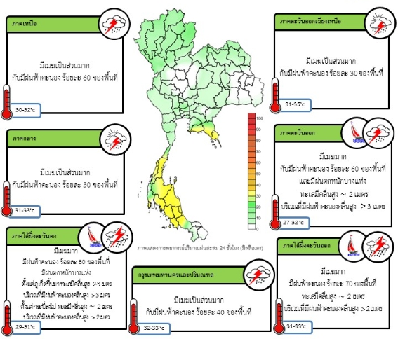 - พยากรณ์อากาศ 24 ชั่วโมงข้างหน้า บริเวณภาคตะวันออก และภาคใต้ยังคงมีฝนตกหนักบางแห่ง ส่วนภาคเหนือ ภาคตะวันออกเฉียงเหนือ และภาคกลางมีปริมาณและการกระจายฝนลดลง ขอให้ประชาชนบริเวณภาคตะวันออก และภาคใต้ฝั่งตะวันตก ระวังอันตรายจากฝนที่ตกหนักและฝนที่ตกสะสม ซึ่งอาจทำให้บริเวณพื้นที่เสี่ยงภัยเกิดน้ำท่วมฉับพลันและน้ำป่าไหลหลากไว้ด้วย สำหรับบริเวณทะเลอันดามันตอนบนมีคลื่นสูง 2-3 เมตร ส่วนอ่าวไทยตอนบนมีคลื่นสูงประมาณ 2 เมตร บริเวณที่มีฝนฟ้าคะนองคลื่นสูงมากกว่า 3 เมตร ขอให้ชาวเรือบริเวณดังกล่าวเพิ่มความระมัดระวังในการเดินเรือ เรือเล็กบริเวณทะเลอันดามันและอ่าวไทยตอนบนควรงดออกจากฝั่ง และหลีกเลี่ยงการเดินเรือในบริเวณที่มีฝนฟ้าคะนอง จนถึงวันที่ 23 มิ.ย. 62 กรุงเทพมหานครและปริมณฑลมีเมฆเป็นส่วนมาก กับมีฝนฟ้าคะนอง ร้อยละ 40 ของพื้นที่ อุณหภูมิต่ำสุด 26-28 องศาเซลเซียส อุณหภูมิสูงสุด 32-33 องศาเซลเซียส ลมตะวันตกเฉียงใต้ ความเร็ว 10-30 กม./ชม.