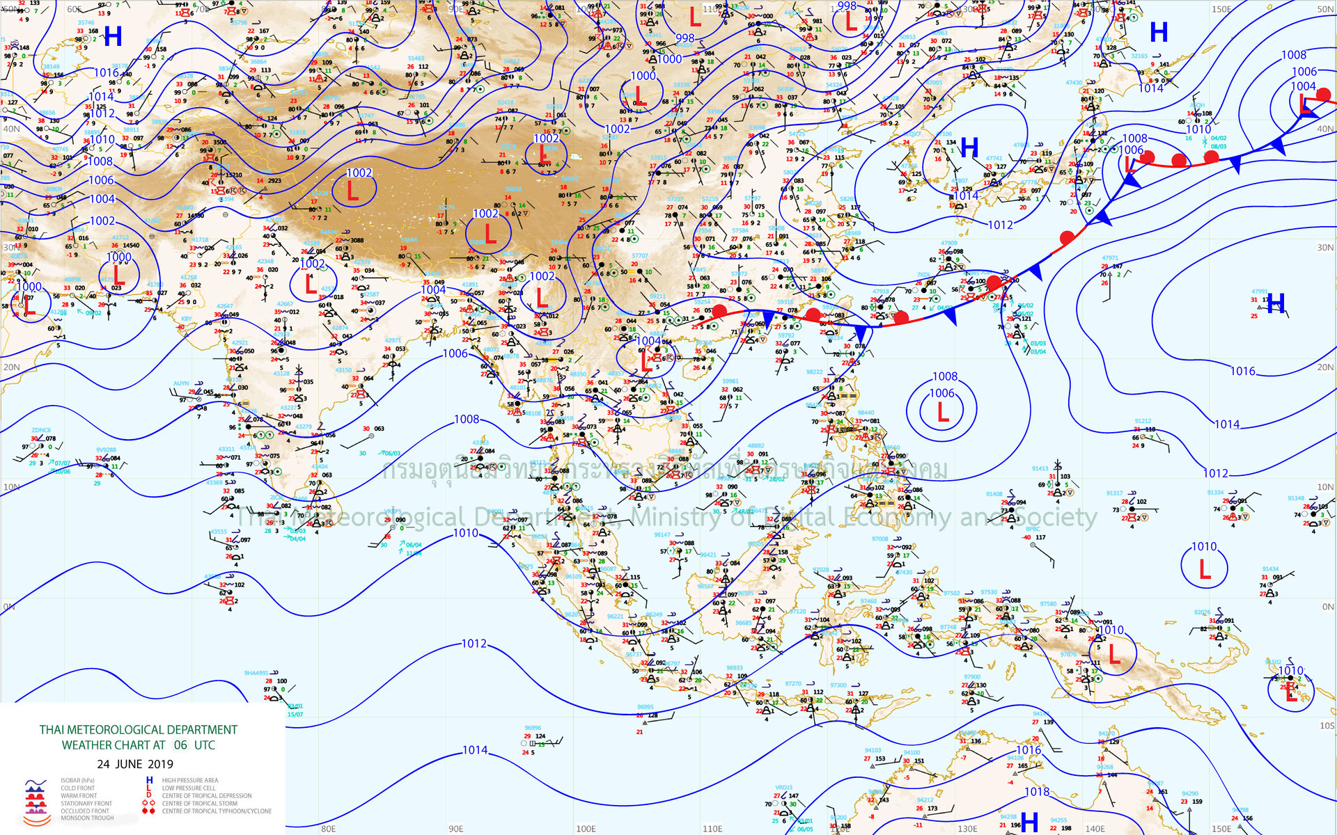 - พยากรณ์อากาศ 24 ชั่วโมงข้างหน้า ประเทศไทยมีฝนเพิ่มขึ้น กับมีฝนตกหนักบางแห่งบริเวณภาคใต้ ภาคตะวันออก และภาคกลาง ขอให้ประชาชนบริเวณภาคใต้ฝั่งตะวันตก และภาคตะวันออกระวังอันตรายจากฝนที่ตกหนัก ซึ่งทำให้เกิดน้ำท่วมฉับพลันน้ำป่าไหลหลากได้ สำหรับบริเวณทะเลอันดามันมีคลื่นสูง 2-3 เมตร ส่วนอ่าวไทยมีคลื่นสูงประมาณ 2 เมตร บริเวณที่มีฝนฟ้าคะนองคลื่นสูงมากกว่า 3 เมตร ขอให้ชาวเรือเดินเรือด้วยความระมัดระวัง โดยหลีกเลี่ยงการเดินเรือในบริเวณที่มีฝนฟ้าคะนอง และเรือเล็กควรงดออกจากฝั่งจนถึงวันที่ 29 มิ.ย. 62