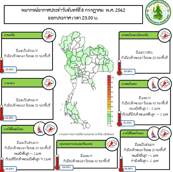 สำหรับกรุงเทพฯ และปริมณฑล มีเมฆมาก กับมีฝนฟ้าคะนอง ร้อยละ 40 ของพื้นที่ อุณหภูมิต่ำสุด 26-27 องศาเซลเซียส อุณหภูมิสูงสุด 33-35 องศาเซลเซียส ลมตะวันตกเฉียงใต้ ความเร็ว 10-20 กม./ชม.