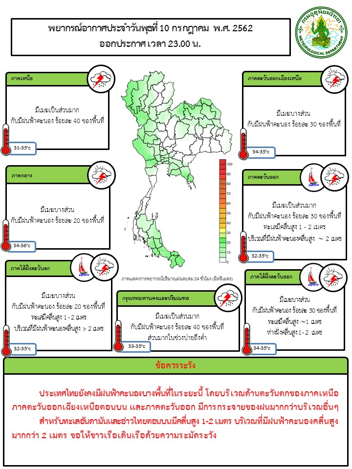 ประเทศไทยยังคงมีฝนฟ้าคะนองบางพื้นที่ในระยะนี้ โดยบริเวณด้านตะวันตกของภาคเหนือ และภาคตะวันออกเฉียงเหนือตอนบน มีการกระจายของฝนมากกว่าบริเวณอื่นๆ สำหรับทะเลอันดามันและอ่าวไทยตอนบนมีคลื่นสูง 1-2 เมตร บริเวณที่มีฝนฟ้าคะนองคลื่นสูงมากกว่า 2 เมตร ขอให้ชาวเรือเดินเรือด้วยความระมัดระวัง