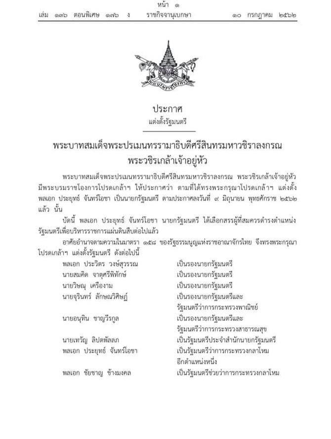 - พระบาทสมเด็จพระปรเมนทรรามาธิบดีศรีสินทรมหาวชิราลงกรณ พระวชิรเกล้าเจ้าอยู่หัว มีพระบรมราชโองการโปรดเกล้าฯ ให้ประกาศว่า ตามที่ได้ทรงพระกรุณาโปรดเกล้าฯ แต่งตั้ง พลเอกประยุทธ์ จันทร์โอชา เป็นนายกรัฐมนตรี ตามประกาศลงวันที่ ๙ มิถุนายน พุทธศักราช ๒๕๖๒ แล้วนั้นบัดนี้ พลเอก ประยุทธ์ จันทร์โอชา นายกรัฐมนตรี ได้เลือกสรรผู้ที่สมควรดำรงตำแหน่ง รัฐมนตรีเพื่อบริหารราชการแผ่นดินสืบต่อไปแล้ว อาศัยอำนาจตามความในมาตรา ๑๕๘ ของรัฐธรรมนูญแห่งราชอาณาจักรไทย จึงทรงพระกรุณาโปรดเกล้าฯ แต่งตั้งรัฐมนตรี ดังต่อไปนี้