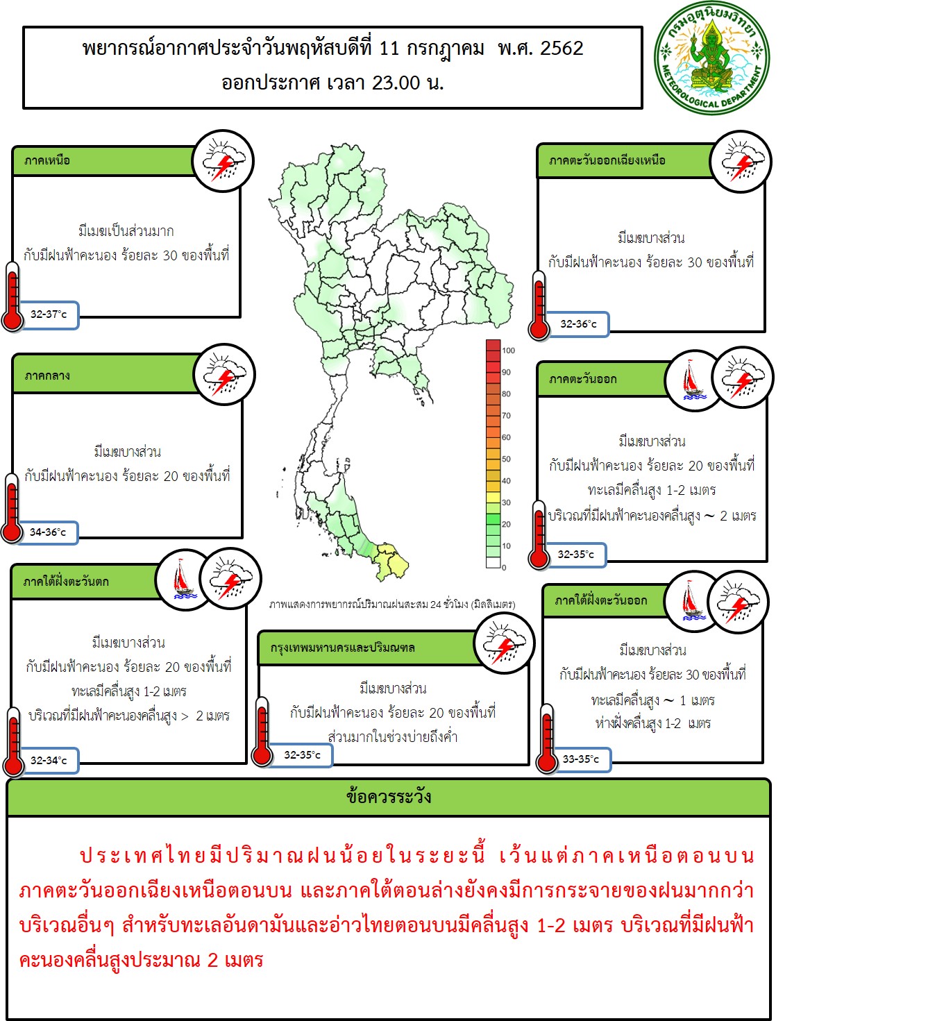 ประเทศไทยมีปริมาณฝนน้อยในระยะนี้ เว้นแต่ภาคเหนือตอนบน ภาคตะวันออกเฉียงเหนือตอนบน และภาคใต้ตอนล่างยังคงมีการกระจายของฝนมากกว่าบริเวณอื่นๆ สำหรับทะเลอันดามันและอ่าวไทยตอนบนมีคลื่นสูง 1-2 เมตร บริเวณที่มีฝนฟ้าคะนองคลื่นสูงประมาณ 2 เมตร มรสุมตะวันตกเฉียงใต้ที่พัดปกคลุมทะเลอันดามัน และประเทศไทยกำลังอ่อนลง ในขณะที่มีหย่อมความกดอากาศต่ำปกคลุมบริเวณประเทศเวียดนามตอนบน ลักษณะเช่นนี้ทำให้ประเทศไทยมีปริมาณฝนน้อยในระยะนี้ ส่วนคลื่นลมบริเวณทะเลอันดามันมีกำลังอ่อน