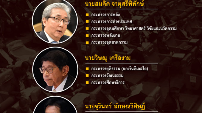 - นายสมคิด จาตุศรีพิทักษ์ กำกับดูแล กระทรวงการคลัง, กระทรวงการต่างประเทศ, กระทรวงอุดมศึกษา วิทยาศาสตร์ วิจัยและนวัตกรรม, กระทรวงพลังงาน, กระทรวงอุตสาหกรรม