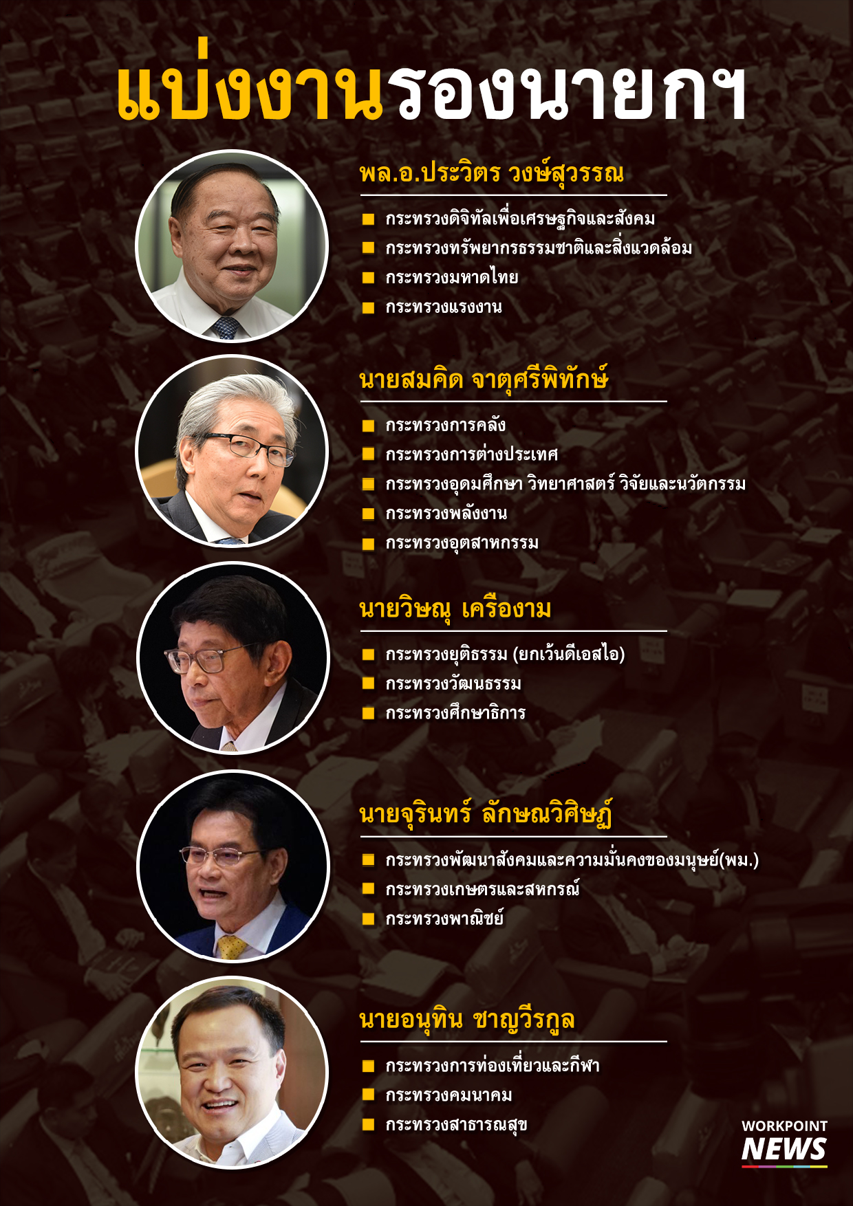 - พล.อ.ประวิตร วงษ์สุวรรณ กำกับดูแล กระทรวงดิจิทัลเพื่อเศรษฐกิจและสังคม, กระทรวงทรัพยากรธรรมชาติและสิ่งแวดล้อม, กระทรวงมหาดไทย, กระทรวงแรงงาน