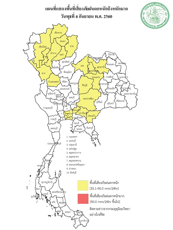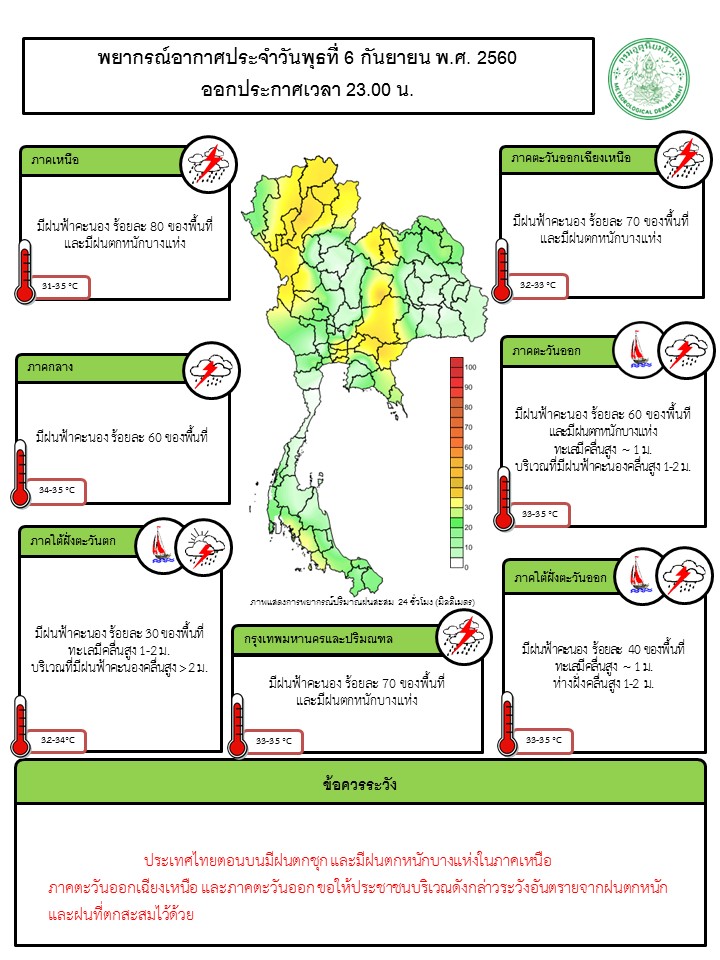- ประเทศไทยตอนบนยังคงมีฝนตกชุก และมีฝนตกหนักบางแห่งในภาคเหนือ ภาคตะวันออกเฉียงเหนือ และภาคตะวันออก ขอให้ประชาชนบริเวณดังกล่าวระวังอันตรายจากฝนตกหนักและฝนที่ตกสะสมไว้ด้วย กรุงเทพมหานครและปริมณฑลมีฝนฟ้าคะนอง ร้อยละ 70 ของพื้นที่ และมีฝนตกหนักบางแห่ง