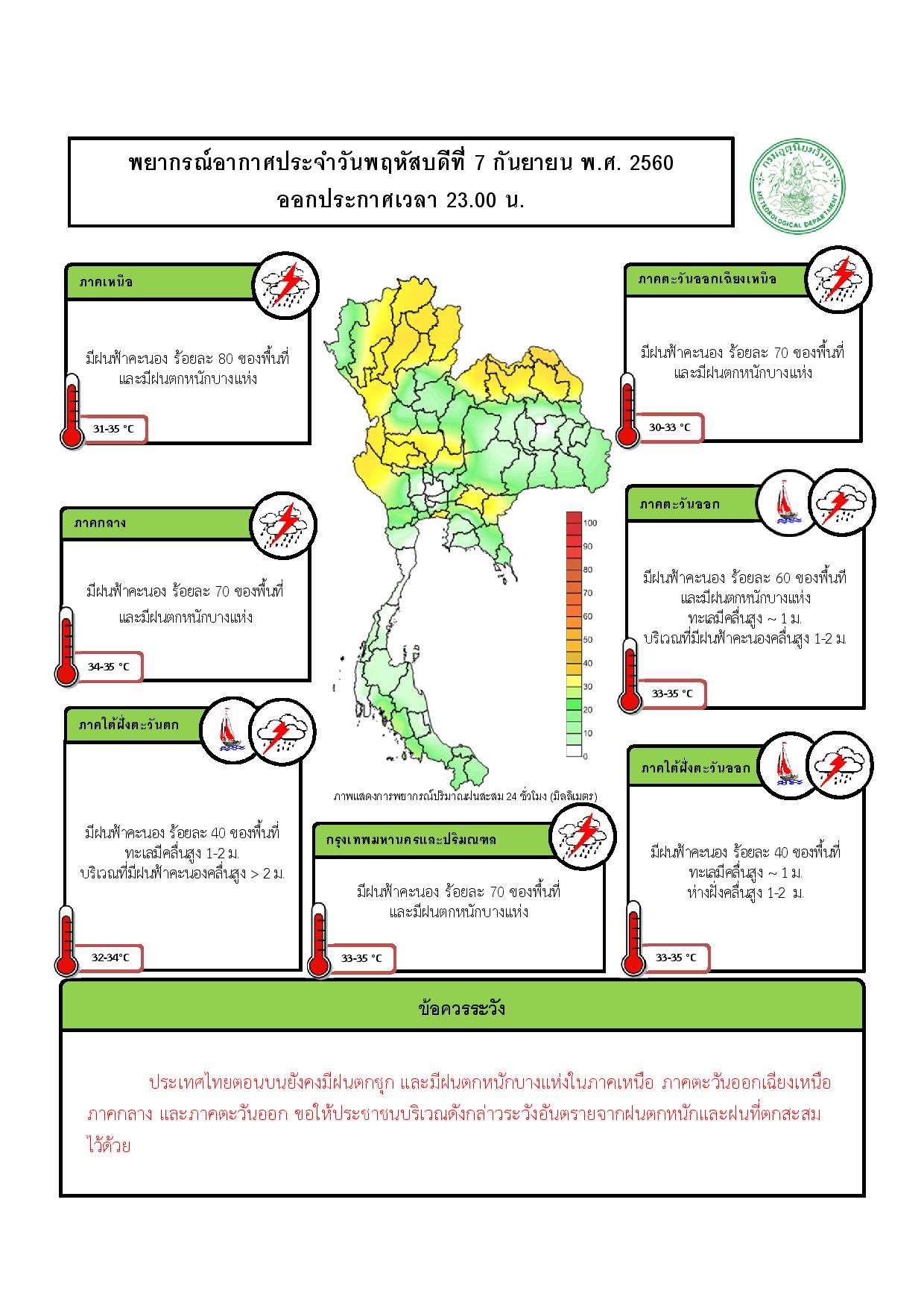 - ประเทศไทยเริ่มมีฝนลดลง แต่ภาคเหนือและภาคใต้ฝั่งตะวันตกยังคงมีฝนมากกว่าภาคอื่นๆ และมีฝนตกหนักบางแห่ง ขอให้ประชาชนบริเวณดังกล่าวระวังอันตรายจากฝนตกหนักและฝนที่ตกสะสมไว้ด้วย