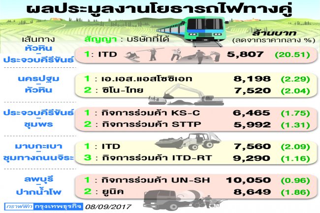 - รฟท. เปิดเผยว่า ได้เปิดประมูลงานโยธาของโครงการรถไฟทางคู่เสร็จสิ้นไปแล้ว 9 สัญญา เหลือแต่เส้นทางมาบกะเบา –