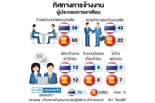 เข้า ครม. ปีนี้ ตั้งเป้าเริ่มก่อสร้างปี 62 เปิดให้บริการปี 65 - จ๊อบดีดีเผยผลสำรวจพบแนวโน้มจ้างกลุ่มไวท์คอลลาร์ (คนทำงานในออฟฟิต) ในตลาดอาเซียนไทยโตแซงหน้าในภูมิภาค ชี้แนวโน้มขยายกิจการ จ้างงานสูงกว่าอาเซียนเท่าตัว ธุรกิจสุขภาพ-การผลิต ต้องการจ้างงานสูงสุด