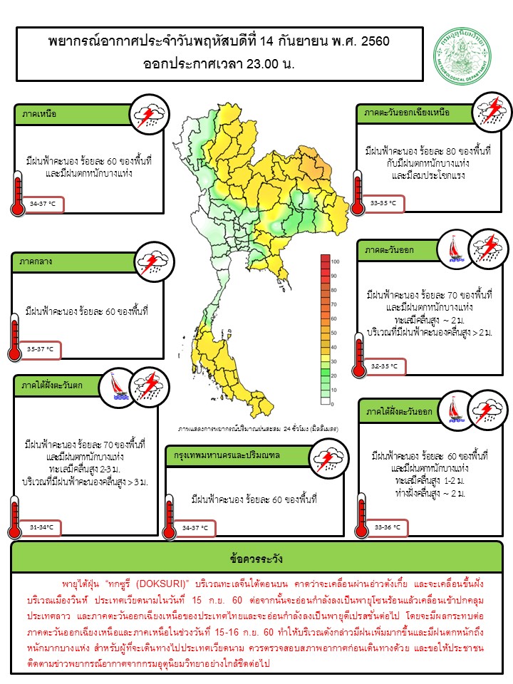 - ประเทศไทยตอนบนมีฝนเพิ่มขึ้น และมีฝนตกหนักบางแห่งบริเวณภาคเหนือ ภาคตะวันออกเฉียงเหนือ ภาคตะวันออก และภาคใต้ ขอให้ประชาชนบริเวณดังกล่าวระวังอันตรายจากฝนตกหนักและฝนที่ตกสะสมไว้ด้วย สำหรับทะเลอันดามันและอ่าวไทยตอนบนมีคลื่นสูง 2-3 เมตร ขอให้ชาวเรือบริเวณดังกล่าวควรเดินเรือด้วยความระมัดระวัง และเรือเล็กบริเวณทะเลอันดามันควรงดออกจากฝั่งในช่วงวันที่ 15-18 ก.ย. 60