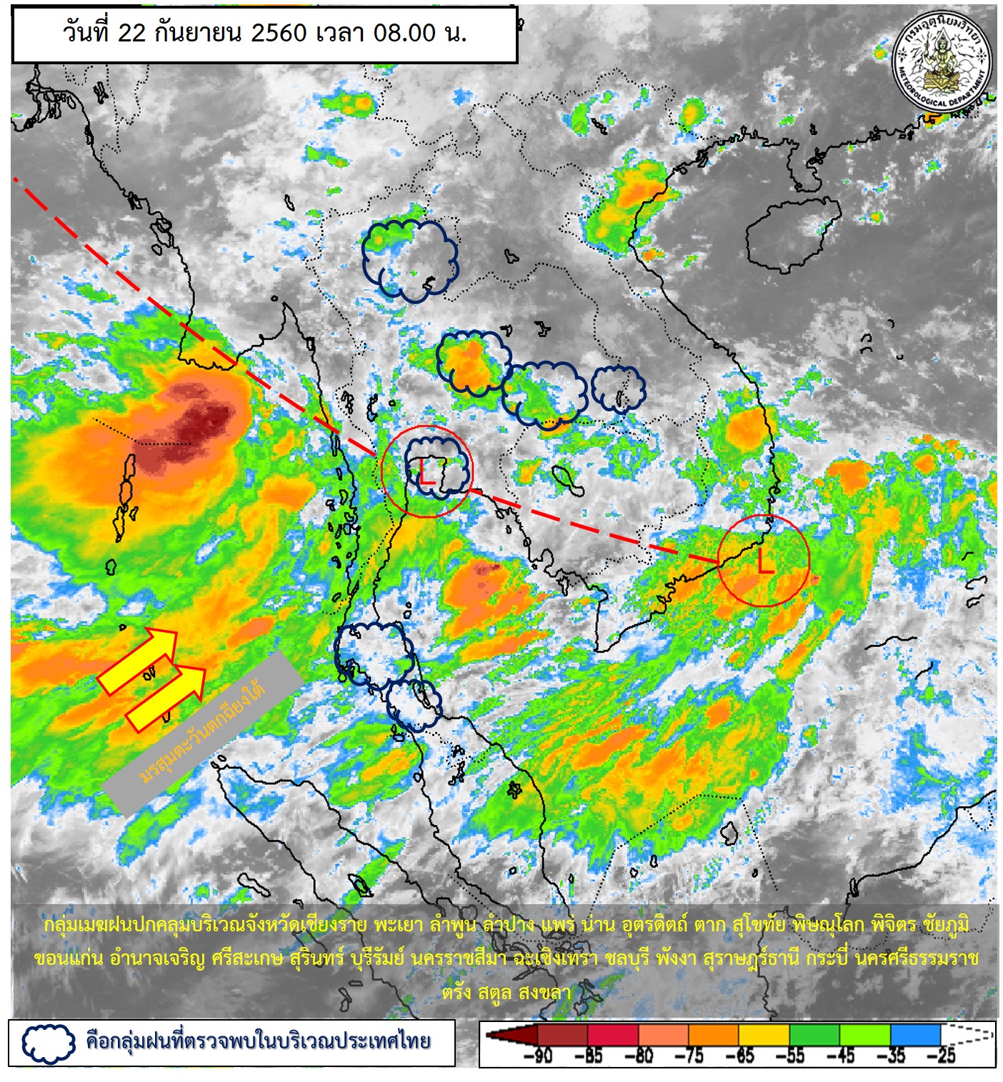 - ในช่วงวันที่ 21 – 23 ก.ย. 60 บริเวณภาคกลางตอนล่างรวมทั้งกรุงเทพฯและปริมณฑล ภาคตะวันออก ภาคตะวันออกเฉียงเหนือตอนล่าง และภาคใต้ มีฝนเพิ่มขึ้น กับมีฝนตกหนักถึงหนักมากบางแห่ง สำหรับภาคเหนือมีฝนน้อย ส่วนในช่วงวันที่ 24 – 26 ก.ย. 60 บริเวณภาคเหนือ ภาคกลาง ภาคตะวันออกเฉียงเหนือ มีฝนเพิ่มขึ้น และมีฝนตกหนักบางแห่ง สำหรับทะเลอันดามันและอ่าวไทยตอนบนมีคลื่นสูง 2-3 เมตร