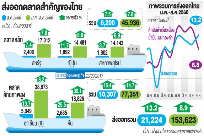 - พณ. เผยตัวเลขส่งออกของไทยในเดือน ส.ค. โต 13.2% (21,224 ล้านดอลลาร์สหรัฐ) สูงสุดรอบ 55 เดือน และ 8 เดือนแรกของปีส่งออกขยายตัว 8.9% (153,623 ล้านดอลลาร์สหรัฐ) สูงสุดรอบ 6 ปี รวมถึงเศรษฐกิจโลกฟื้นดันตลาดหลักสหรัฐ จีน ญี่ปุ่น อาเซียน โตทุกตลาด ส่วนสินค้าเกษตรและอุตสาหกรรมดีทั้งราคาและปริมาณ คาดส่งออกทั้งปีได้ตามเป้า 7%