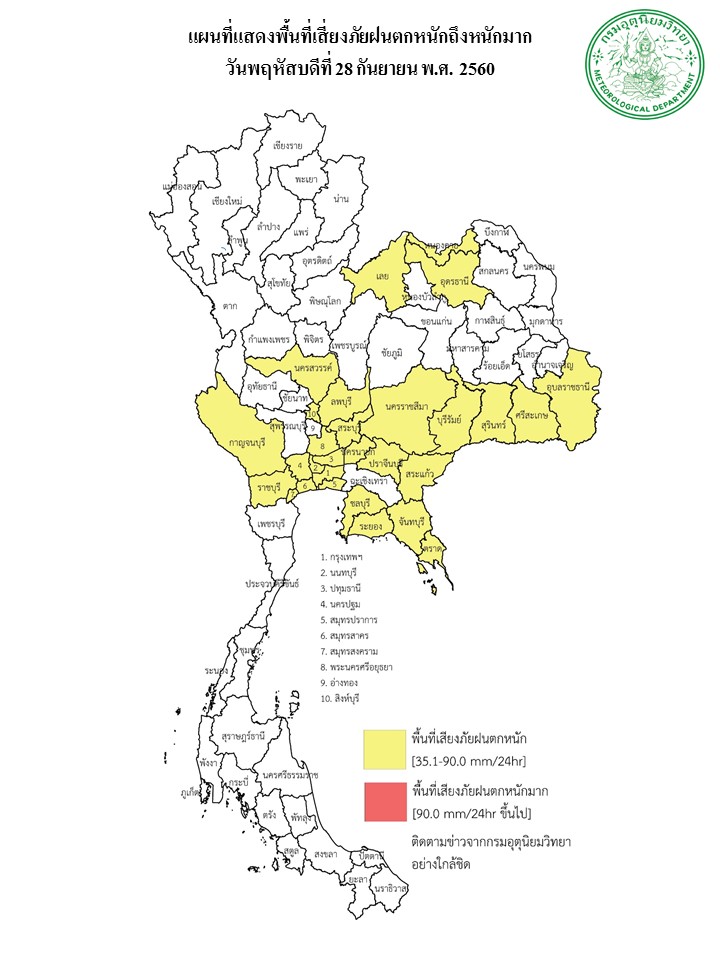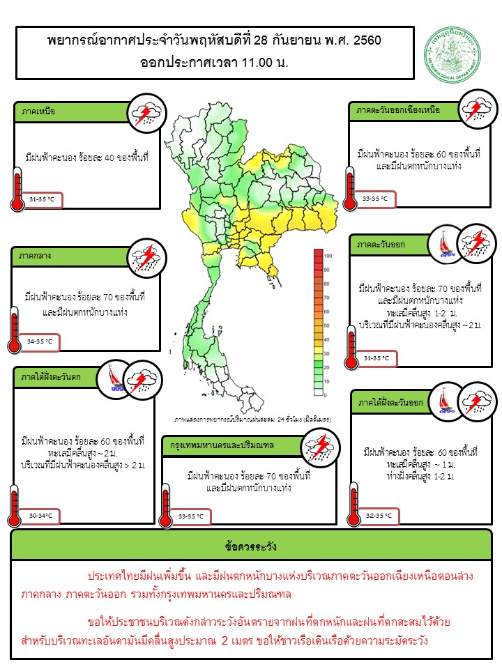 - ประเทศไทยมีฝนเพิ่มขึ้น และมีฝนตกหนักบางแห่งบริเวณภาคตะวันออกเฉียงเหนือตอนล่าง ภาคกลาง ภาคตะวันออก รวมทั้งกรุงเทพมหานครและปริมณฑล ขอให้ประชาชนบริเวณดังกล่าวระวังอันตรายจากฝนที่ตกหนักและฝนที่ตกสะสมไว้ด้วย สำหรับบริเวณทะเลอันดามันมีคลื่นสูงประมาณ 2 เมตร ขอให้ชาวเรือเดินเรือด้วยความระมัดระวัง