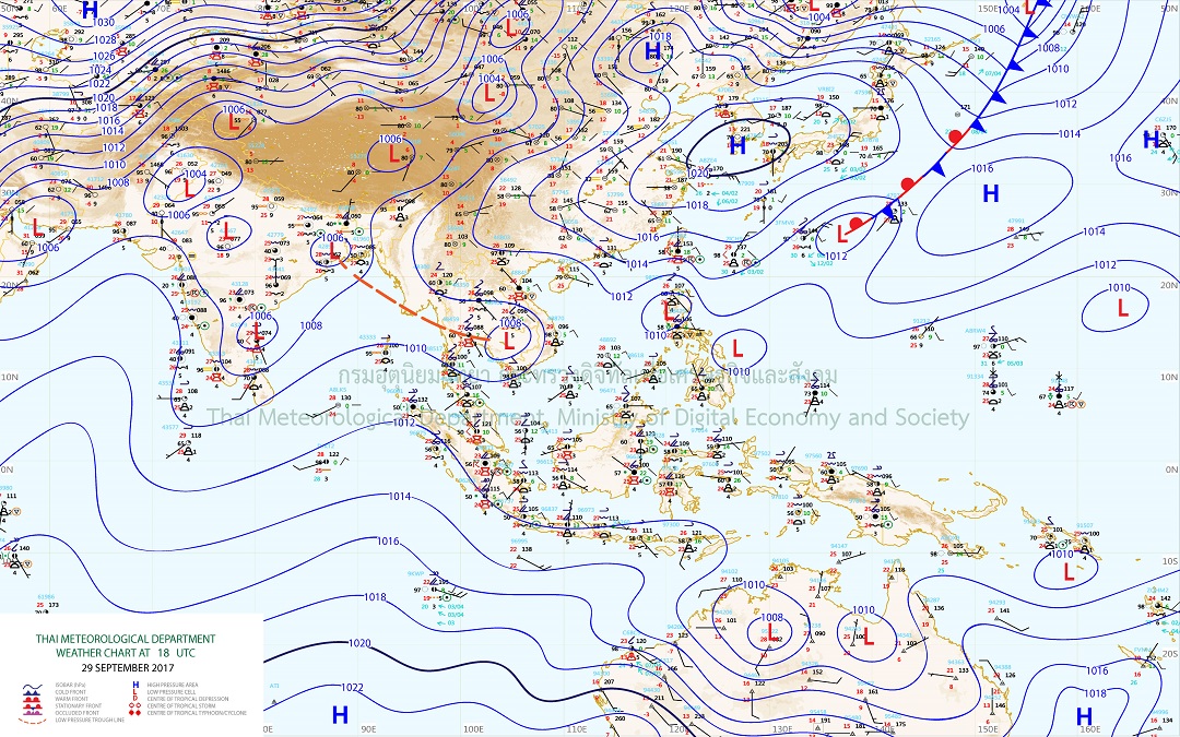 - ประเทศไทยมีฝนตกต่อเนื่อง และมีฝนตกหนักบางแห่งบริเวณภาคตะวันออกเฉียงเหนือตอนล่าง ภาคกลาง ภาคตะวันออก รวมทั้งกรุงเทพมหานครและปริมณฑล ขอให้ประชาชนบริเวณดังกล่าวระวังอันตรายจากฝนที่ตกหนักและฝนที่ตกสะสมไว้ด้วย สำหรับบริเวณทะเลอันดามันมีคลื่นสูงประมาณ 2 เมตร ขอให้ชาวเรือเดินเรือด้วยความระมัดระวัง