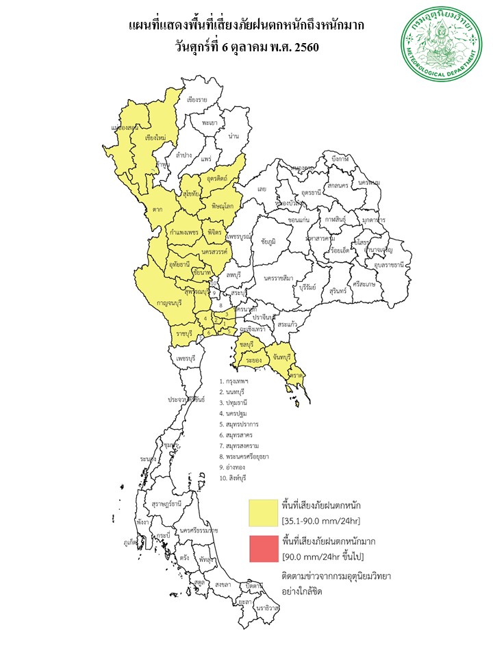 - ประเทศไทยมีปริมาณฝนลดลง แต่ยังคงมีฝนตกหนักบางพื้นที่บริเวณภาคเหนือตอนล่าง ภาคกลาง และภาคตะวันออก ขอให้ประชาชนบริเวณดังกล่าวระวังอันตรายจากฝนตกหนักและฝนตกสะสมไว้ด้วย