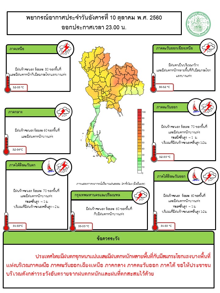 - ประเทศไทยมีฝนตกชุกหนาแน่นและมีฝนตกหนักหลายพื้นที่และมีลมกระโชกแรงบริเวณภาคเหนือ ภาคตะวันออกเฉียงเหนือ ภาคกลาง ภาคตะวันออก และภาคใต้ ขอให้ประชาชนบริเวณดังกล่าวระวังอันตรายจากฝนตกหนักและฝนที่ตกสะสมไว้ด้วย