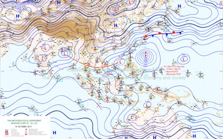 - บริเวณความกดอากาศสูงจากประเทศจีนที่ปกคลุมภาคตะวันออกเฉียงเหนือ ภาคเหนือ และภาคกลาง เริ่มมีกำลังอ่อนลงลักษณะเช่นนี้ทำให้ประเทศไทยตอนบนมีฝนน้อย สำหรับร่องมรสุมกำลังอ่อนพาดผ่านภาคใต้ตอนบนเข้าสู่หย่อมความกดอากาศต่ำบริเวณทะเลจีนใต้ตอนกลาง ประกอบกับมรสุมตะวันตกเฉียงใต้ที่พัดปกคลุมทะเลอันดามันและภาคใต้มีกำลังอ่อนลง ลักษณะเช่นนี้ทำให้ภาคใต้มีฝนน้อยในระยะนี้