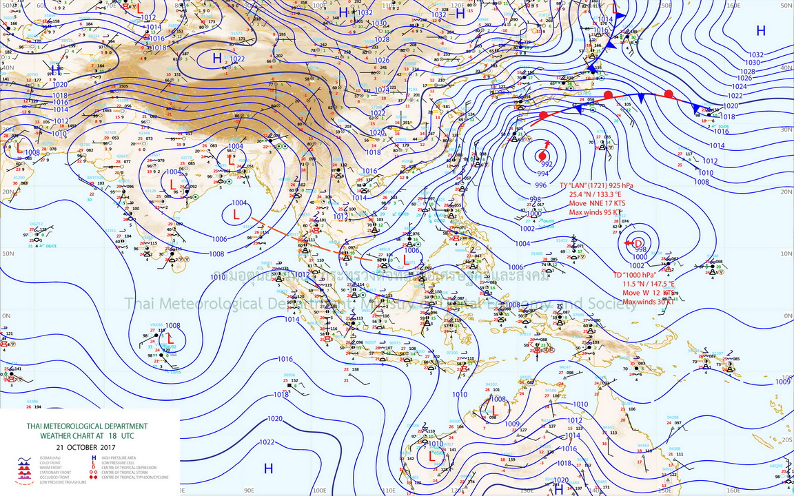 - ในช่วงวันที่ 21-23 ต.ค. ประเทศไทยตอนบนจะมีฝนฟ้าคะนองและมีฝนตกหนักบางแห่งกับมีลมกระโชกแรงบริเวณภาคเหนือ ภาคตะวันออกเฉียงเหนือ ภาคกลาง และภาคตะวันออก ส่วนในช่วงวันที่ 24-27 ต.ค. ประเทศไทยตอนบนจะมีอากาศเย็นลงและอุณหภูมิจะลดลง 2-5 องศาเซลเซียสกับมีลมแรง ส่วนภาคใต้มีฝนเพิ่มมากขึ้นและมีฝนตกหนักบางแห่ง