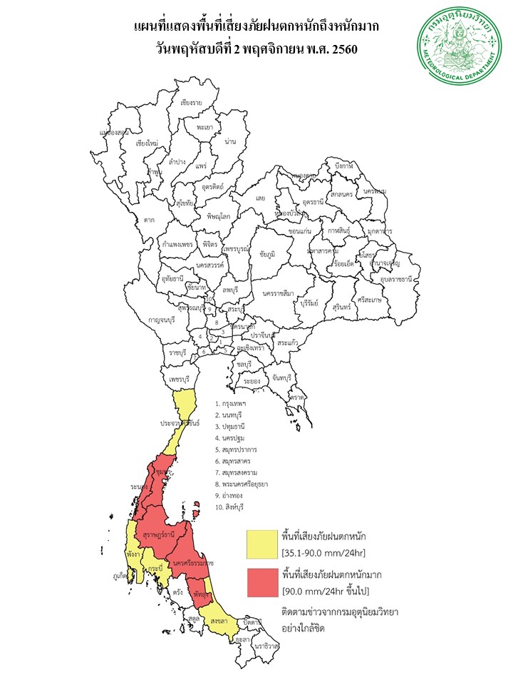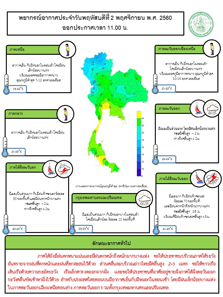 - ภาคใต้ยังมีฝนตกชุกหนาแน่นและมีฝนตกหนักถึงหนักมากบางแห่ง ขอให้ประชาชนบริเวณภาคใต้ระวังอันตรายจากฝนที่ตกหนักและฝนที่ตกสะสมไว้ด้วย ส่วนคลื่นลมบริเวณอ่าวไทยมีคลื่นสูง 2-3 เมตร ขอให้ชาวเรือเดินเรือด้วยความระมัดระวัง เรือเล็กควรงดออกจากฝั่ง และขอให้ประชาชนที่อาศัยอยู่ชายฝั่งภาคใต้ฝั่งตะวันออกระวังคลื่นซัดเข้าหาฝั่งไว้ด้วย สำหรับประเทศไทยตอนบนมีอากาศเย็นกับมีหมอกในตอนเช้า โดยมีฝนเล็กน้อยบางแห่งในภาคตะวันออกเฉียงเหนือตอนล่าง ภาคตะวันออก รวมทั้งกรุงเทพมหานครและปริมณฑล