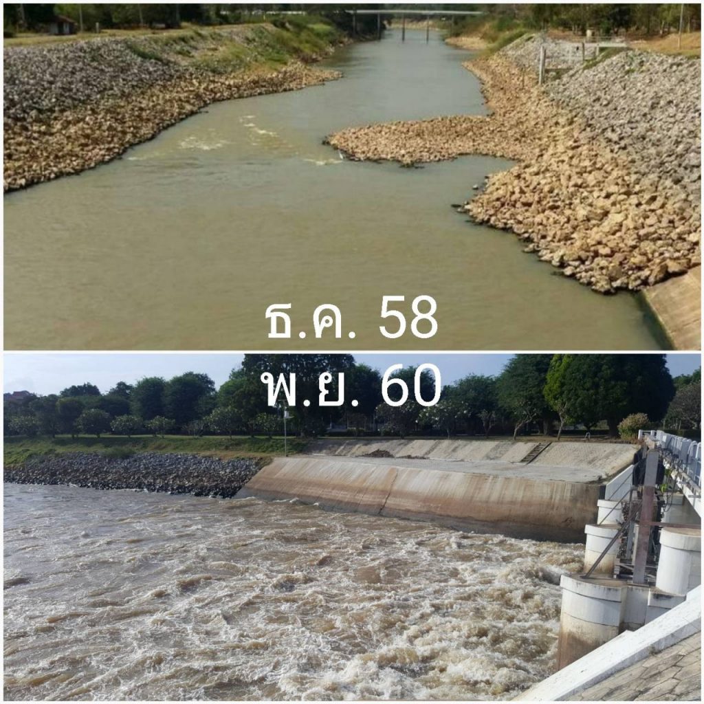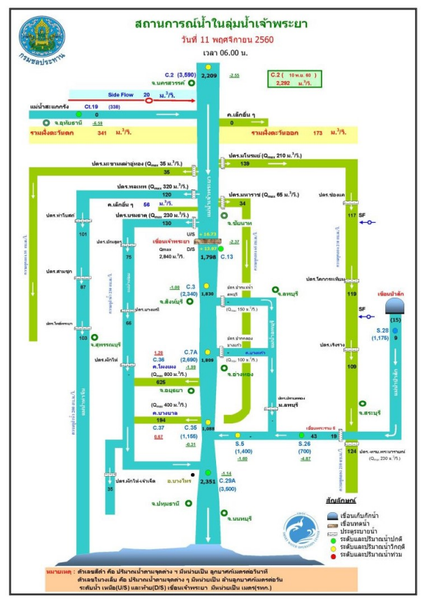– สถานการณ์น้ำท่วมลดลงจากสถานการณ์วิกฤติระดับ 3 มาอยู่ที่ระดับ 2 ตั้งแต่วันที่ 6 พ.ย. 60 โดยอ่างเก็บน้ำขนาดใหญ่และขนาดกลางมีปริมาตรน้ำสะสมอยู่ที่ร้อยละ 84 สูงกว่าปีที่ผ่านมาถึงร้อยละ 14 พื้นที่ประสบอุทกภัยในภาคกลางโดยเฉพาะพื้นที่รับน้ำจากลุ่มแม่น้ำเจ้าพระยามีระดับน้ำลดลงอย่างต่อเนื่อง ขณะที่จังหวัดสุพรรณบุรีซึ่งรับน้ำจากลุ่มแม่น้ำท่าจีนยังคงอยู่ในสถานการณ์ทรงตัว การปล่อยน้ำจากแม่น้ำเจ้าพระยาลงสู่แม่น้ำสาขายังคงไว้ที่ระดับเดิมจากสัปดาห์ที่ผ่านมาที่ รวมฝั่งตะวันตก 341 ลบ.ม./วิ และรวมฝั่งตะวันออก 175 ลบ.ม./วิ สูงกว่าปี 58 ซึ่งประสบภัยแล้งอย่างหนัก 6 เท่า