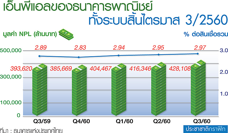 – ธนาคารแห่งประเทศไทยเปิดเผยถึงผลการดำเนินงานของระบบธนาคารพาณิชย์ในไตรมาส 3 ว่า สินเชื่อของระบบธนาคารพาณิชย์ทรงตัวต่อเนื่อง ขณะที่สินเชื่ออุปโภคบริโภคขยายตัวได้ต่อเนื่อง แต่ในกรณีของคุณภาพสินเชื่อที่ไม่ก่อให้เกิดรายได้ (NPL) เริ่มทรงตัวและมีแนวโน้มลดลงสำหรับธุรกิจขนาดกลางและขนาดย่อม (SME) ซึ่งแสดงให้เห็นถึงผลกระทบจากการชะลอตัวของเศรษฐกิจในช่วงที่ผ่านมา
