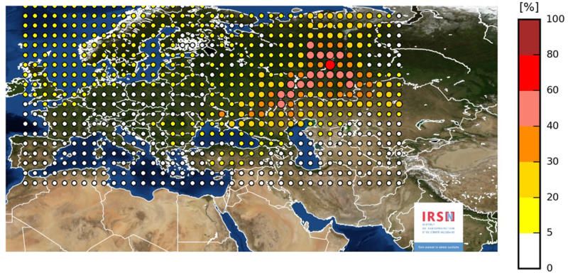 ในชั้นบรรยากาศของทวีปยุโรป ซึ่งมีข้อสันนิษฐานว่ากลุ่มเมฆดังกล่าวอาจปนเปื้อนกัมมันตรังสีจากโรงงานนิวเคลียร์ในประเทศรัสเซียหรือคาซัคสถานช่วงปลายเดือนกันยายนที่ผ่านมา