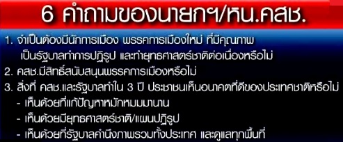 – ศูนย์บริการประชาชน สำนักงานปลัดสำนักนายกรัฐมนตรี และศูนย์ดำรงธรรมทั่วประเทศ ได้เปิดให้ประชาชนร่วมตอบคำถาม 6 ข้อ ของ นรม. ในวันที่ 13 พ.ย. 60 เป็นวันแรก ซึ่งประชาชนที่เข้าร่วมตอบคำถามฯ มีความเข้าใจในเจตนาของ นรม. ที่ต้องการให้ประชาชนออกมาแสดงความคิดเห็น เพื่อที่จะได้นำความเห็นทั้งหมดไปกำหนดเป็นแนวทางการบริหารประเทศในอนาคตต่อไป