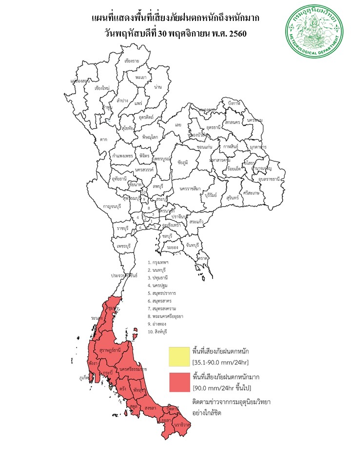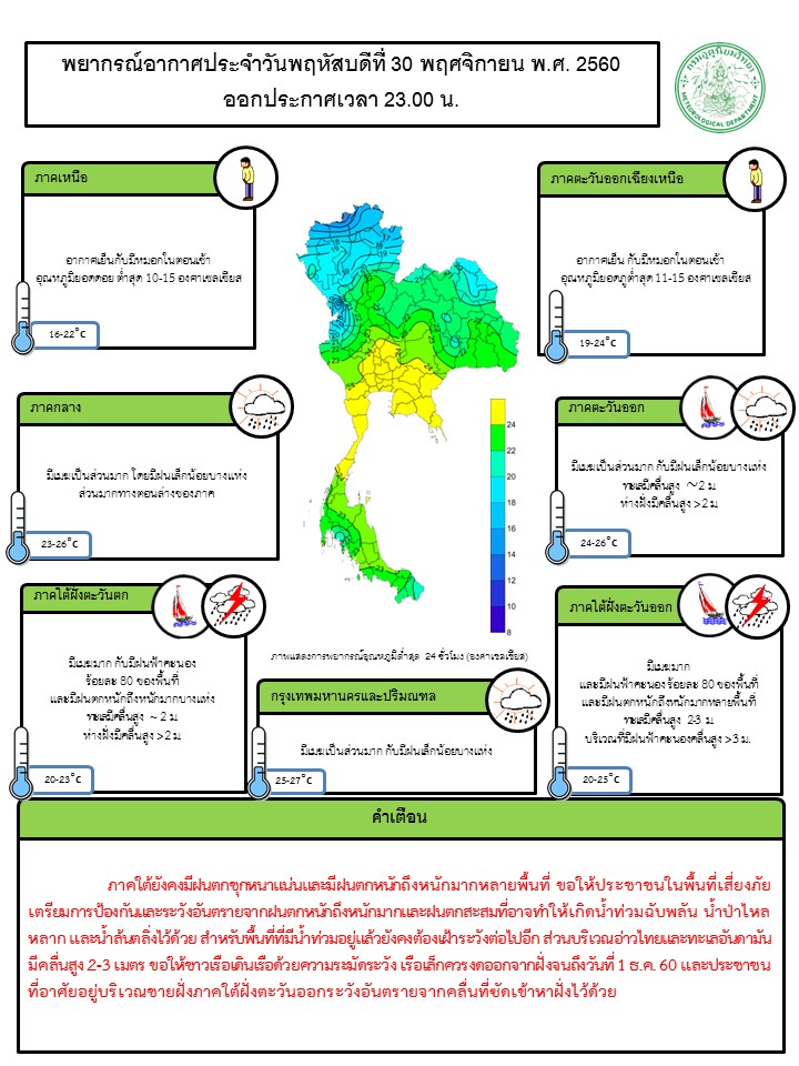 - ภาคใต้ยังคงมีฝนตกชุกหนาแน่นและมีฝนตกหนักถึงหนักมากหลายพื้นที่ ขอให้ประชาชนในพื้นที่เสี่ยงภัยเตรียมการป้องกันและระวังอันตรายจากฝนตกหนักถึงหนักมากและฝนตกสะสมที่อาจทำให้เกิดน้ำท่วมฉับพลัน น้ำป่าไหลหลาก และน้ำล้นตลิ่งไว้ด้วย สำหรับพื้นที่ที่มีน้ำท่วมอยู่แล้วยังคงต้องเฝ้าระวังต่อไปอีก ส่วนบริเวณอ่าวไทยและทะเลอันดามันมีคลื่นสูง 2-3 เมตร ขอให้ชาวเรือเดินเรือด้วยความระมัดระวัง เรือเล็กควรงดออกจากฝั่งจนถึงวันที่ 1 ธ.ค. 60 และประชาชนที่อาศัยอยู่บริเวณชายฝั่งภาคใต้ฝั่งตะวันออกระวังอันตรายจากคลื่นที่ซัดเข้าหาฝั่งไว้ด้วย สำหรับภาคตะวันออกเฉียงเหนือมีอากาศหนาวเย็นลงกับมีลมแรง และอุณหภูมิจะลดลง 2-4 องศาเซลเซียส ส่วนภาคเหนือ ภาคกลาง ภาคตะวันออก รวมทั้งกรุงเทพมหานครและปริมณฑลจะได้รับผลกระทบในระยะต่อไป