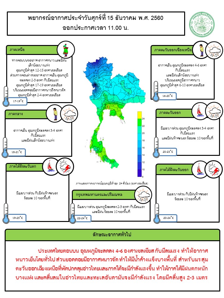 - ประเทศไทยตอนบนอุณหภูมิจะลดลง 4-6 องศาเซลเซียส กับมีลมแรง ทำให้อากาศหนาวเย็นโดยทั่วไป ส่วนยอดดอยมีอากาศหนาวจัด ทำให้มีน้ำค้างแข็งบางพื้นที่ สำหรับมรสุมตะวันออกเฉียงเหนือ