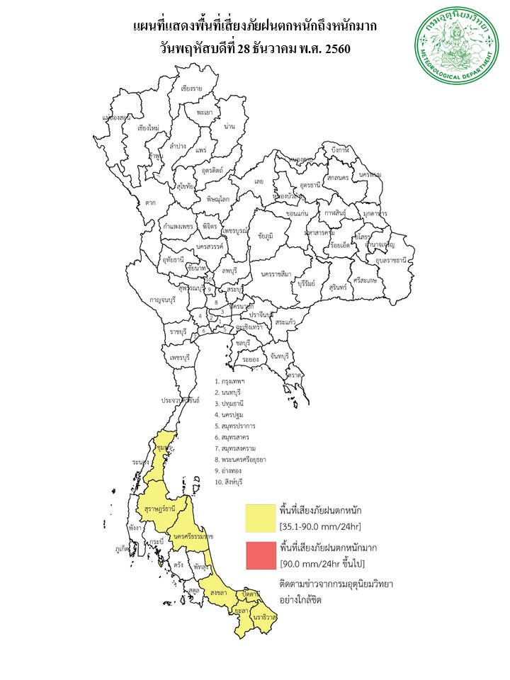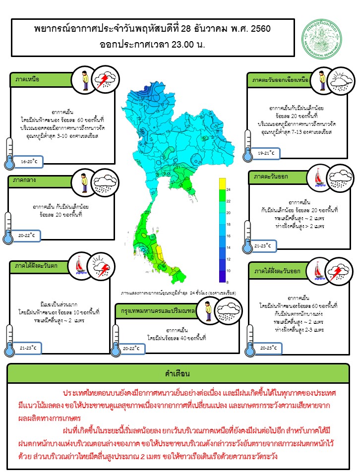 - ประเทศไทยตอนบนยังคงมีอากาศเย็น และฝนที่เกิดขึ้นในทุกภาคของประเทศมีแนวโน้มลดลง ขอให้ประชาชนดูแลสุขภาพเนื่องจากอากาศที่เปลี่ยนแปลง และเกษตรกรควรระวังความเสียหายจากผลผลิตทางการเกษตร ฝนที่เกิดขึ้นในระยะนี้เริ่มลดน้อยลง ยกเว้นบริเวณภาคเหนือที่ยังคงมีฝนต่อไปอีก สำหรับภาคใต้มีฝนตกหนักบางแห่งบริเวณตอนล่างของภาค ขอให้ประชาชนบริเวณดังกล่าวระวังอันตรายจากสภาวะฝนตกหนักไว้ด้วย ส่วนบริเวณอ่าวไทยมีคลื่นสูงประมาณ 2 เมตร ขอให้ชาวเรือเดินเรือด้วยความระมัดระวัง